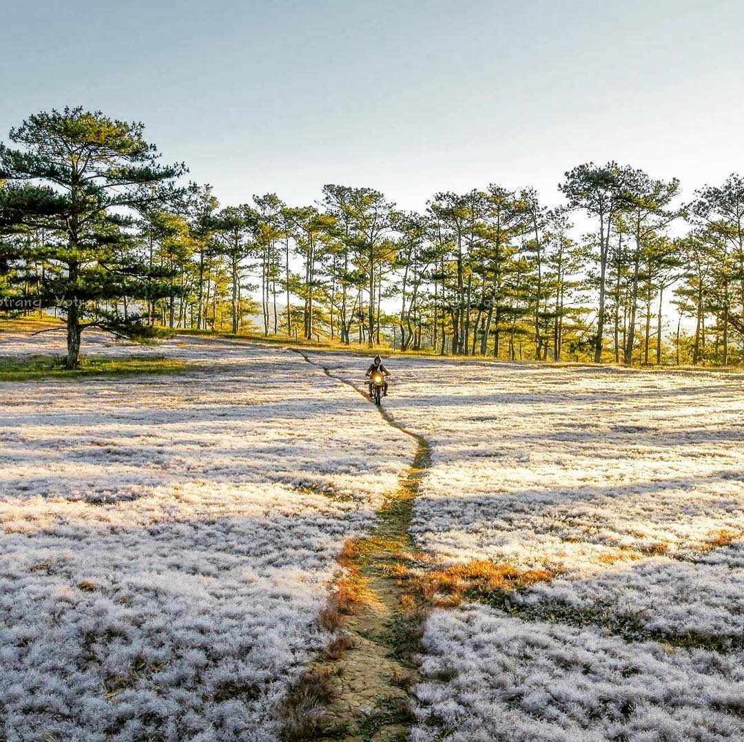 Cũng là những khóm cỏ đó, những trước khi ánh mặt trời ló dạng, soi sáng cả một vùng trời xứ sở thì chúng lại khoác trên mình một lớp sương đêm dầy, trắng muốt tựa sương muối, mềm mượt như tuyết trắng phủ khắp một ngọn đồi ở xứ sở nhiệt đới này.