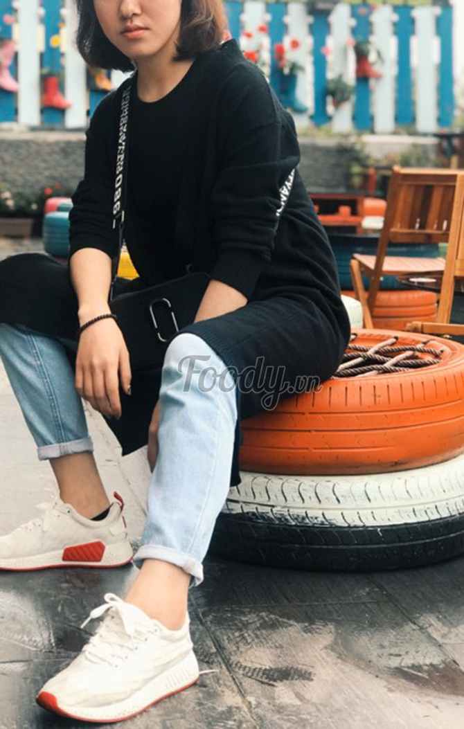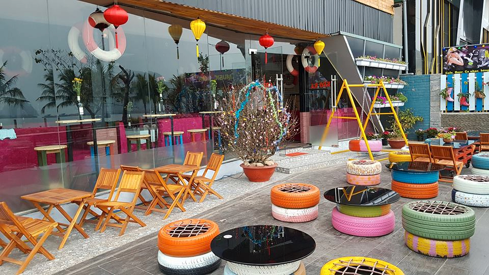 Khoảng sân với xích đu và những chiếc ghế rực rỡ được lấy ý tưởng từ những chiếc lốp xe chính là một trong thiết kế ấn tượng trong không gian của quán, được các bạn trẻ mê mẩn.