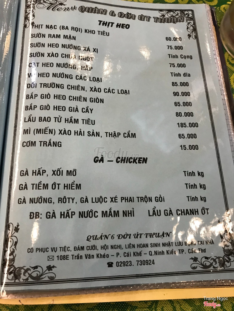 8.66 Đời Út Thuận - Gà & Các Món Hải SảnHôm trước cả nhà mình có ghé đây ăn lẩu. Do là khách quen của quán 6 đời 2 bên Mậu Thân nên nghe tin chị chủ mở thêm quán dưới Trần Văn Khéo cũng tới ủng hộ. Mình ăn là lẩu Thái, do mẹ trả tiền không đưa bill mình nên quên mất giá bao nhiêu rồi, chỉ nhớ tầm 100 mấy, nói chung giá cả phải chăng mà chất lượng ok lắm, đồ ăn không nhiều nhưng được cái tươi, nước dùng nêm nếm vừa ăn. Menu quán đa dạng lắm luôn, cũng có nhiều món nướng nữa. Đặc biệt nhân viên phục vụ rất nhiệt tình. ...Xem thêm