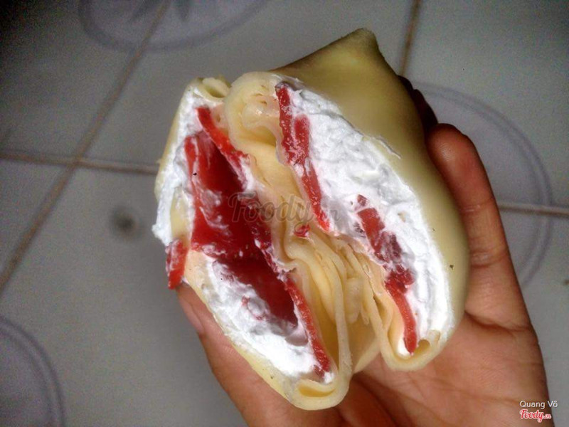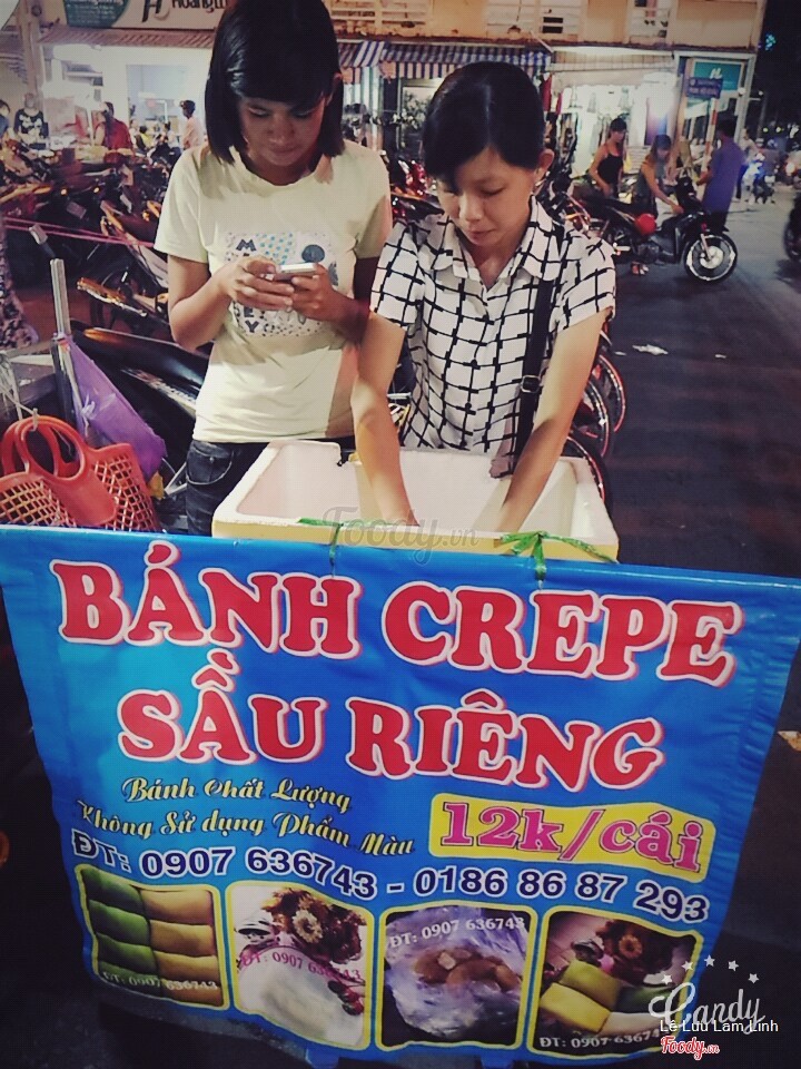 7.0Bánh crepeLần đầu tiên mình mua bánh crepe ăn. Mua 2 cái: ba mẹ ăn 1 mình ăn 1 :)) Lớp vỏ bánh mềm, mịn màng dẻo dẻo có hai loại vàng và xanh. Bánh lành lạnh cắn là đã thích miệng rồi. Lớp kem ở viềng ngoài, bên trong cùng là sầu riêng béo ngậy ngọt ngào. Cả cái bánh ăn cứ y chang 1 múi sầu riêng không hạt luôn. Ba mẹ mình khen ngon, mình cũng thấy ngon cú mèo. Rồi là bắt đầu bổ sung vào danh sách món ăn vặt dù tăng cân nhưng hay thèm. Giá 12k / cái. ...Xem thêm