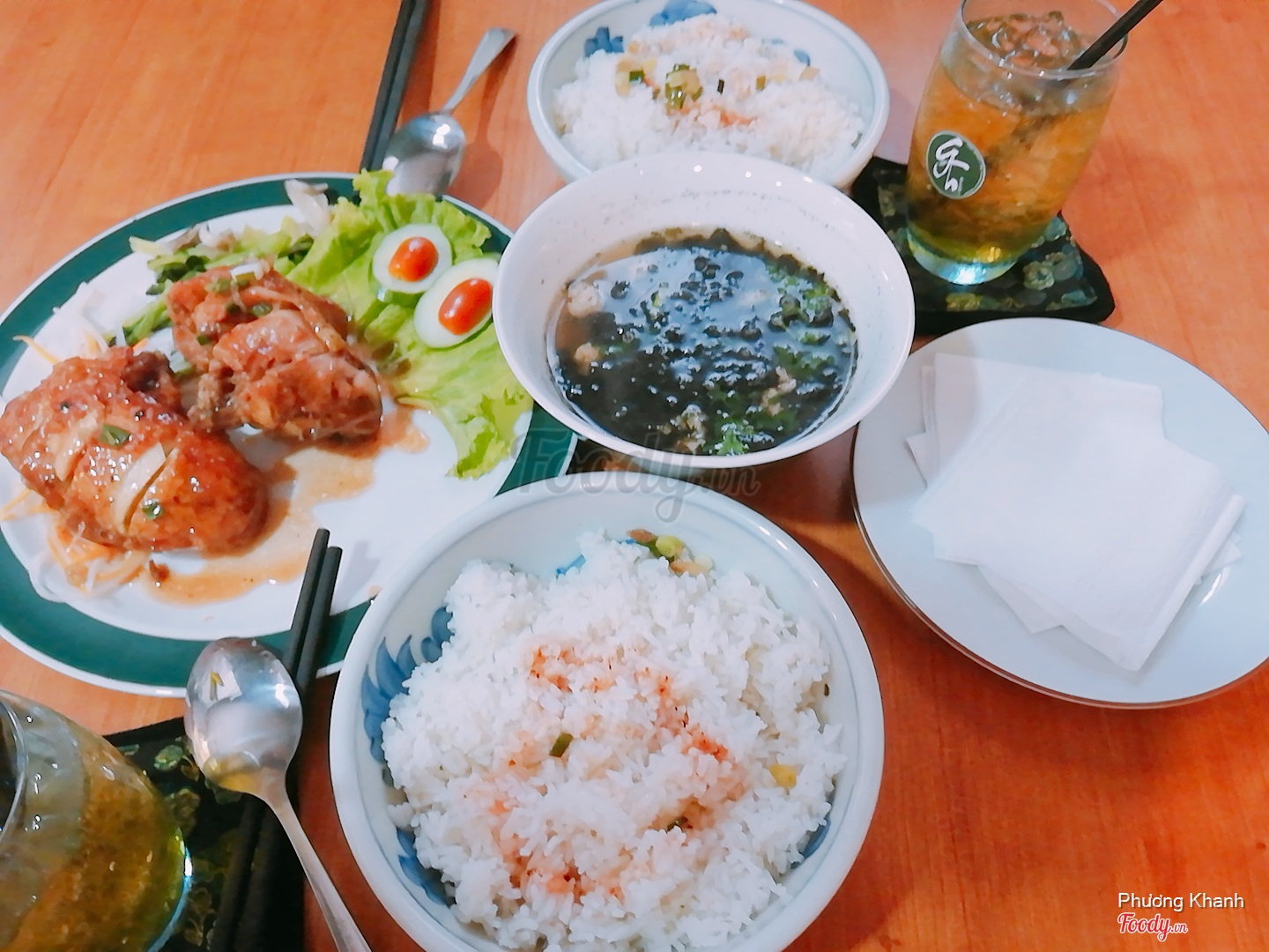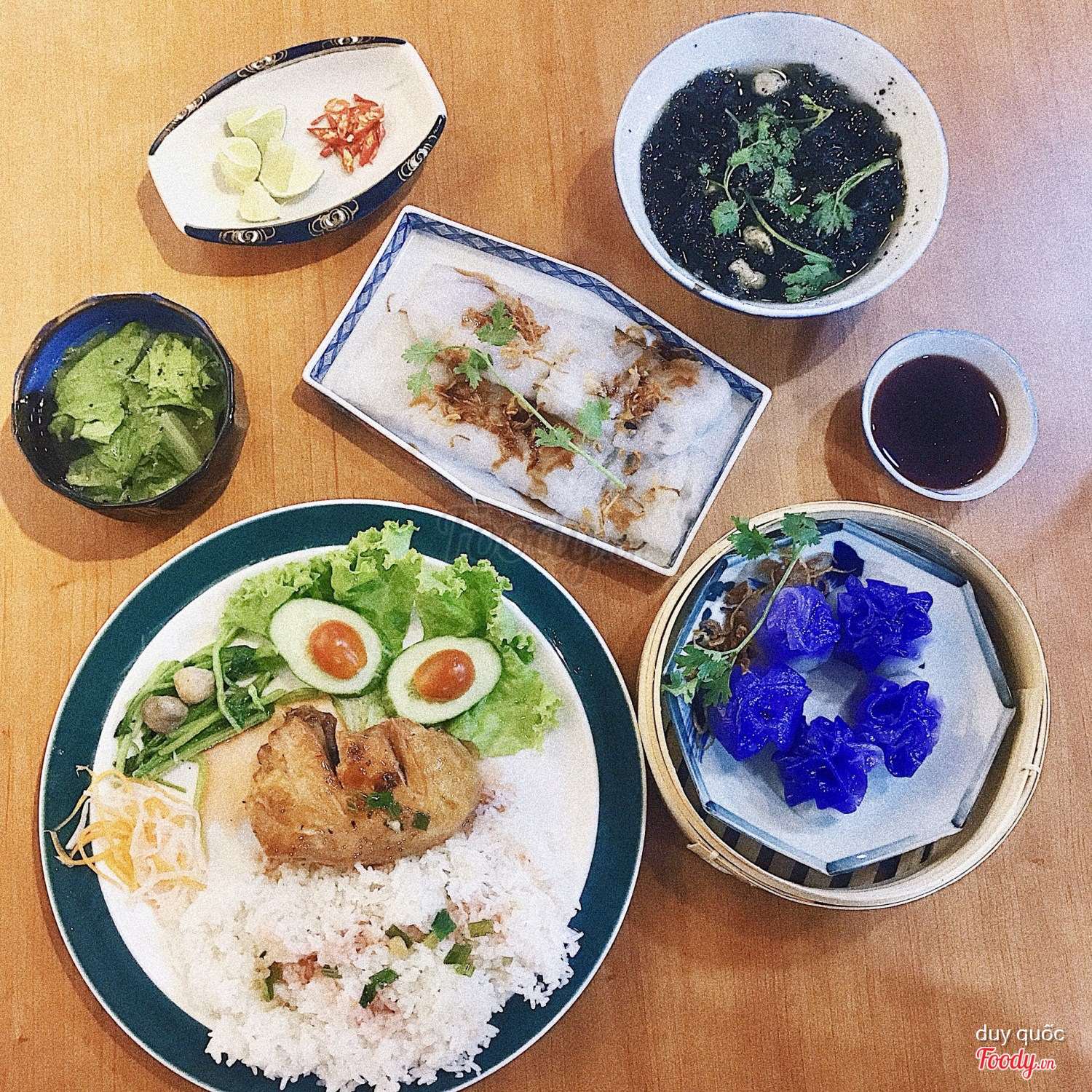Cơm gà xá xíu + Há cảo + Bánh cuốn tôm thịt + canh rong biển