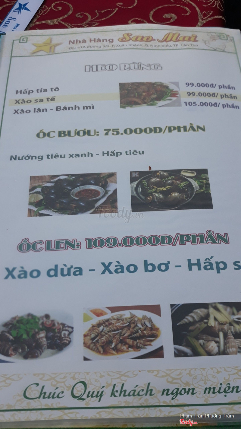 8.2Nhà Hàng Sao MaiLần đầu lại nhà hàng Sao Mai này ăn luôn. Không gian khá rộng rãi, phía trước có bãi giữ xe cực rộng nữa. Phục vụ nhanh, lịch sự. Menu đa dạng món. Mấy món thường thì giá cũng tương đương mấy chỗ khác, nêm nếm cũng khá ngon. Chỉ có hải sản là mắc ngang ngửa Biển Đông nên không dám kêu luôn :)) Mỗi món ra cũng ít ít à, không nhiều. Quán tương đối đông nhưng thoáng và không ồn, bàn ghế sạch sẽ nữa. Giá cả với chất lượng tương xứng, đồ ăn đa dạng, làm nhanh. ...Xem thêm