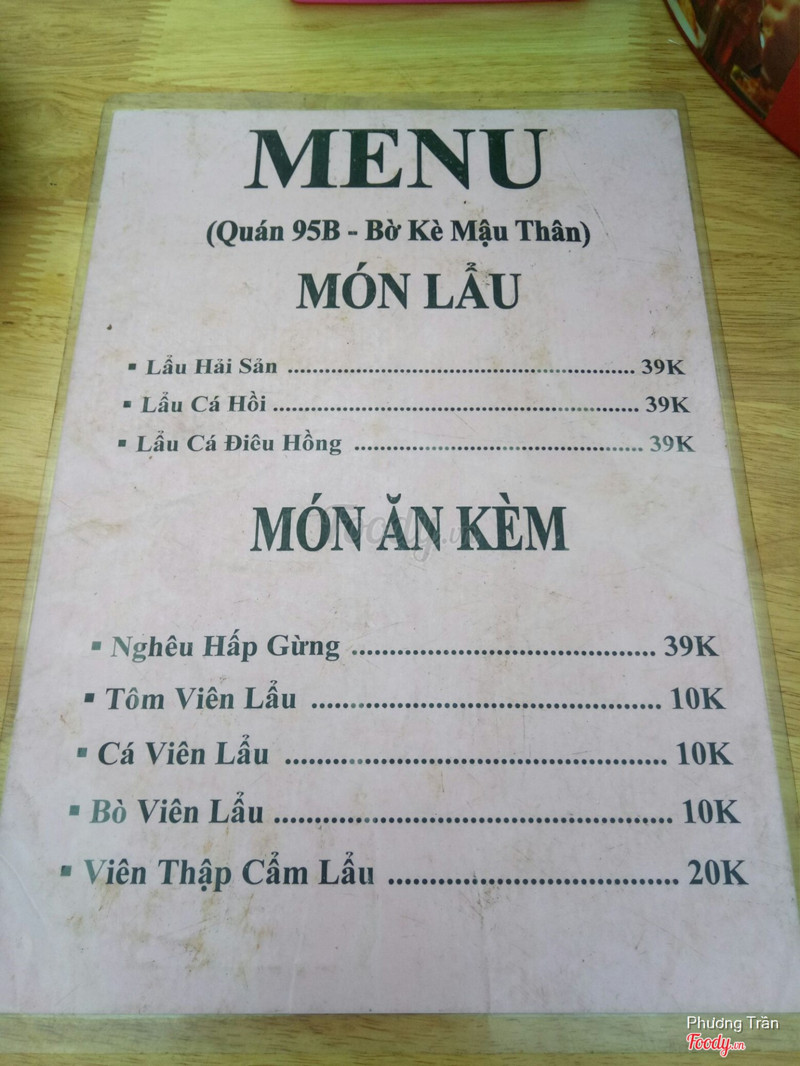 8.4Quán 95B - Bờ Kè Mậu ThânMình đi một vòng ở bờ kè đường Mạc Thiên Tích thì phát hiện ra có quá nhiều quán lẩu nhỏ nhỏ y chang nhau nên không biết ghé quán nào, để an toàn mình ghé quán mình đã ăn và để lại ấn tượng tốt, quán lẩu 39k ở địa chỉ 95b đường Mạc Thiên Tích. Không gian quán khá rộng rãi, ngoài trời nên rất thoáng mát, muốn ăn đồ nướng cũng không bị ngộp bởi quá nhiều khói. Trong hình là lẩu hải sản, chỉ 39k thôi, một mình mình ăn là quá trời no, nước nêm vừa miệng, hải sản tươi, thấy hài lòng lắm với 39k bỏ ra. ...Xem thêm