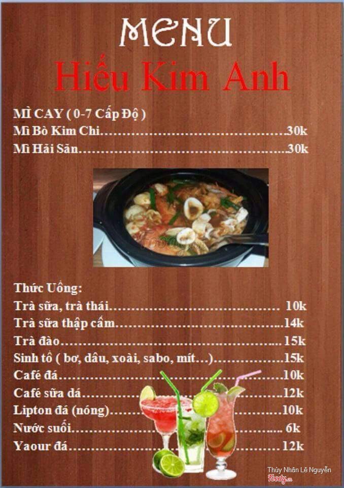 7.2Quán Hiếu Kim Anh - Mì Kim ChiRất thường ăn mì cay ở đây, nhiều đồ ăn, giá trung bình. Có điều hơi cay hơn so với mì cùng cấp độ ở omega. Mì độ 0 hơi chua. Phục vụ vui vẻ. Quán hơi nhỏ, cũng khá dễ thương và mát mẻ. ...Xem thêm