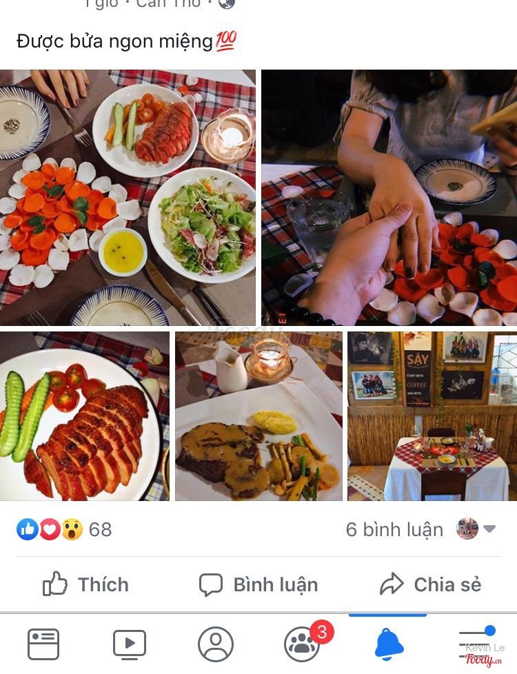 8.0Không gian và thức ăn tuyệt vờiKhi đặt bàn có thể nhờ trang trí bàn sẵn mà không mất phí. Thức ăn thì tuyệt vô cùng, nêm ướp vừa ăn, nguyên liệu xịn, rất vừa miệng. Không gian trang trí khá đẹp và chất. Nói chung là đáng tiền. Must try ở Cần Thơ và các buổi hẹn hò. ...Xem thêm