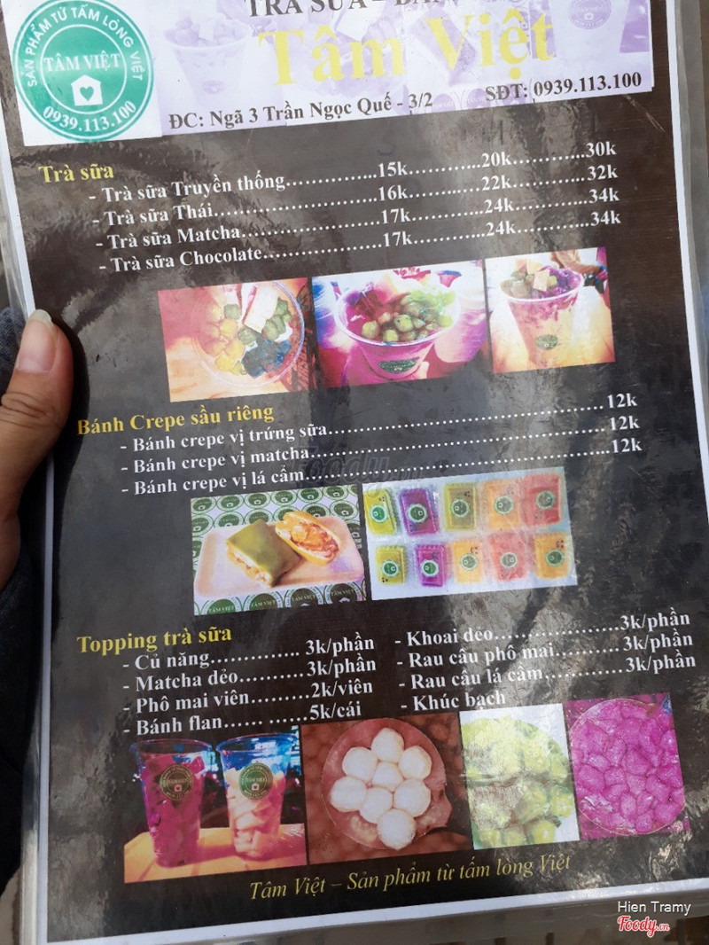 8.4Tâm Việt - Trà Sữa & Bánh CrepeTừ hồi trà sữa Tâm Việt mới mở là mình biết tới quán rồi. Quán nằm trên đường 3 tháng 2, rất dễ tìm, nằm ngay chỗ Yamaha ngay góc đường Trần Ngọc Quế. Hôm đó mình mua 1 ly trà sữa truyền thống giá 15k mà đa dạng các loại topping luôn. Topping tự làm từ rau củ quả nên không chỉ ngon mà còn rất an toàn cho sức khỏe. Trà sữa thì đậm đặc, thơm vị trà và sữa rõ rệt, ngọt vừa phải. Topping nhiều, đầy cả ly, ăn vô là ghiền. Xe trà sữa cũng khá gần trường nên mình cũng thường xuyên qua ủng hộ ^^. Quán còn có bánh crepe sầu riêng nữa, bạn nào thích món đấy có thể ghé qua ăn thử ^^ ...Xem thêm