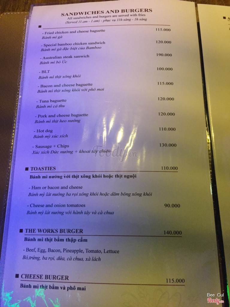 8.0Bamboo Bar - Bạch ĐằngBé bạn ra Đà Nẵng chơi hú đi coffee khuya mà chả còn quán nào mở nên ghé vào đây. Mình gọi 1 ly Sex In The Beach, mấy đứa gọi 3 ly nước ép trái cây, 1 chai và 1 dĩa hoa quả. Tổng thiệt hại hơn 300k. Nhạc ở đây hay. Có cho khách chọn bài để phát nữa. Nhà vệ sinh ở đây hơi bất tiện. Tầng trên có bàn chơi billiards. Khách Tây ở đây khá đông. Nhân viên ok. Sẽ ghé lại. ...Xem thêm