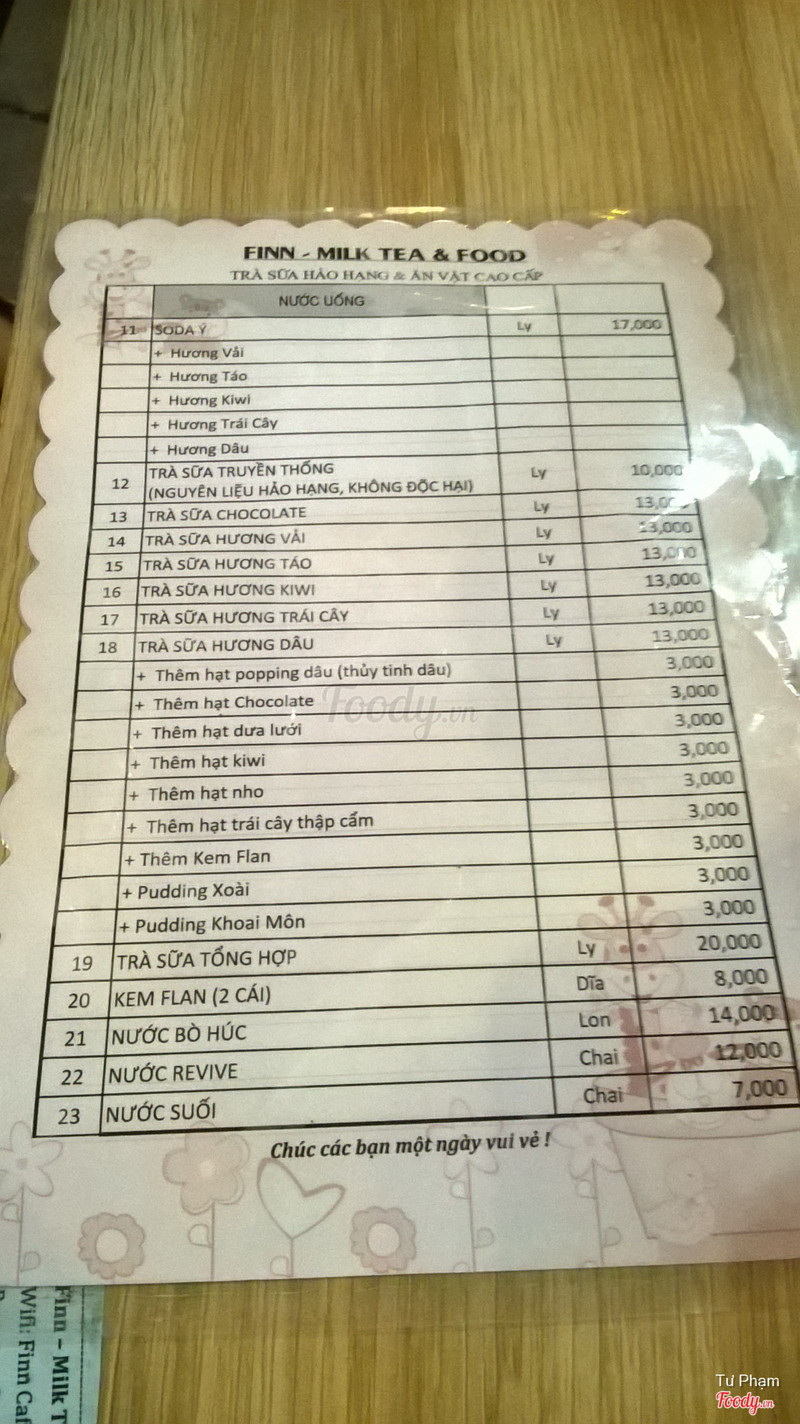 7.8Finn CafeGhé quán vào buổi tối để ăn uống cho mát mẻ :). Khi ghé thì thấy quán cũng có khách ngồi ngoài vĩa hè nên tụi mình chọn ngồi trong nhà. Quán nhỏ nhỏ và chưa bày trí hết nên còn đơn giản :), anh chị chủ nhiệt tình vui vẻ và rất niềm nở với khách. Menu cũng có đồ uống đầy đủ như cafe, trà sữa các loại và một số nước khác. Quán bán cả đồ ăn vặt và đa dạng món. Giá cả khá ổn. Tụi mình đi đông nên mỗi người gọi một vị nước khác nhau. Các loại trà sữa của quán khá ổn. Đồ ăn tương đối ngon, chỉ còn một số chỗ nhỏ nhỏ chưa ổn nhưng tụi mình đều góp ý riêng với anh chị chủ quán và được anh chị nhiệt tình nghe, điều này làm mình thấy thoải mái hihi. ...Xem thêm