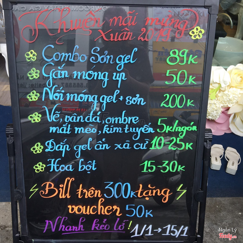 8.8Chất lượngMình đến chỗ ni nhờ chị bạn giới thiệu Mình làm cả tay chân, làm da, sơn gel có 4 ngón kim tuyến,... đc quán tặng cho tẩy tế bào chết nữa Chị làm tư vấn khá nhiệt tình, thân thiện, dễ thương Làm khá nhanh ấy Sơn đều màu, k bị quá dày, nhìn k bị thô Hết tất cả là 320k Khá hài lòng ...Xem thêm