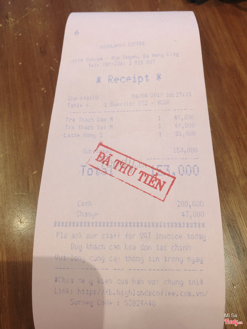 8.6Highlands Coffee - Vincom Đà NẵngHighlands coffee Tầng trệt vincom center 910A***Highlands với vinmart khai trương cùng ngày là mồng 4, người ra vào nhộn nhịp hẳn. Mìnb order 1 trà sen vàng, thêm 2 freeze trà xanh take away về cho nhà mình. Cứ gọi là chờ mỏi mòn luôn. Biết là lễ tết khách đông nhưng gần 1 tiếng mới ra ly nước làm mình oải quá chừng. Bù lại nhân viên thân thiện liên tục giải thích và xin lỗi mong mình thông cảm. Đi buổi tối nên trà sen vàng hết mất củ năng thường decor trên lớp kem sữa ấy. Nhưng trà vẫn ngon, hạt sen mềm ngọt. Kem sữa dày, đặc ngon cực. Nên ghé nếu vào vincom nè mn ^^ ...Xem thêm