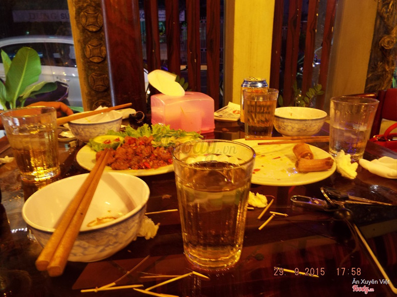 8.6Kiến Tửu Quán - Các Món NhậuKiến tửu làm lại rộng rãi, hợp mới thời đại hơn là Kiến tửu của 5 năm về trước Không gian tầng 1 mở, thoáng, cơ mà hơi ồn ào, bạn mình có 1 người đang mang thai nên bọn mình ngồi tầng trên gần ban công thoáng hơn, và tránh khói thuốc Quán có 1 tầng lửng cỡ 3 bàn và tầng 2 Kiến tửu xưa giờ nổi tiếng thịt thỏ, nhắc tới Kiến tửu là nhắc tới thỏ, mình thực tế không khoái món này lắm, lâu lâu ăn cho vui thì được, hôm nay bọn mình chỉ gọi thỏ rô ti, còn lại là những món ăn nhậu dân dã như bình thường, mùi vị ổn, chỉ có măng trong món sườn um măng mình cảm giác hơi bị cũ, mặc dù nước dùng rất vừa miệng, đậm đà À ở đây có khá nhiều loại rượu ngâm hay ho, lần rau uống thử mình sẽ review kĩ hơn ...Xem thêm