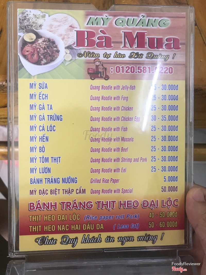 6.4Không bao giờ quay lạiThấy bà Mua mở gần nhà mừng húm chạy vào ăn, ai dè thất vọng nhiều so với các quán khác. Được: không gian đẹp, sạch sẽ, sáng sủa, mới mở nên đồ mới toanh, thịt tạm ổn Chưa được: Mì quảng cá lóc: nhạt nhẽo, cá lóc thì khô dai như dăm bông. Mắm hơi mặn, mì lá quấn bánh tráng thì bé tẹo 😂, ăn được dĩa thịt thì hết xà lách, chuối dưa xoài, và một số rau thơm xin 3, 4 lần mới được vài lá xà lách, quán thì có mỗi nhà mình ngồi, nhưng chờ đem rau ra mà mún khóc luôn Chanh dây thì tưởng đâu chanh muối ...Xem thêm