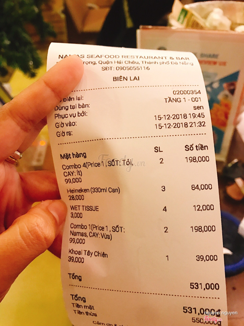 7.4Namas RestaurantĐược Foody tặng voucher nên mình ghé mua mang về ăn thử Trước khi đến mình có tham khảo menu trước thì thấy giá như vậy Nhưng khi mình gọi combo thì chỉ bán phần cho 2 người nên giá sẽ double lên so với menu. Bản thân mình thấy k happy cho lắm vì k hiểu vậy nhà hàng show giá ra như vậy làm chi, thôi thì để giá đã double lên và note cho 2 người Thôi lỡ vào thì mình chọn đại xô đặc biệt 1 giá 99k double lên là 198k, may dùng voucher nên còn 98k thôi Một combo khá phong phú, tôm sú, vẹm xanh, ghẹ biển, xúc xích, bắp,... đc chọn 1 trong 4 loại sốt, mình gọi sốt Namas, nghe bảo thành phần chính là chanh dây, ăn với bánh mì, sốt khá ít, hơi ngọt và nhạt nhạt, k đánh bật được vị chanh dây và khá nhạt nhoà Topping ăn được, do sốt ít và nhạt nên mình k thấy thấm và đậm đà lắm Nhân viên khá dễ thương, chuyên nghiệp Không gian bé xinh, decor vừa phải Nói chung là tạm được! ...Xem thêm