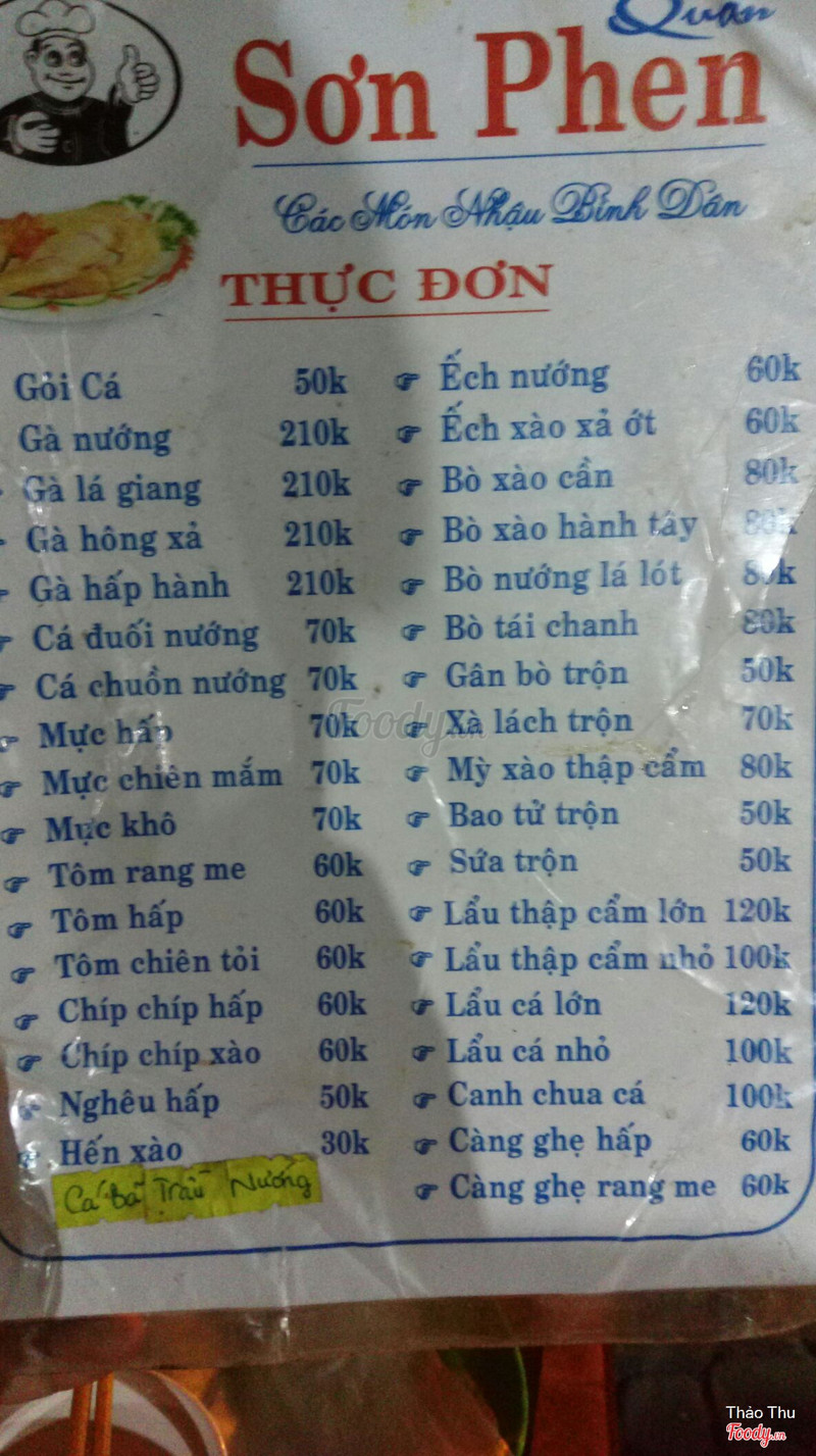 9.2Ngon... đã.... hít hàMenu ghi Sơn Phen mak sao cái bảng hiệu là Sơn Cường... quán có 3 ông bà phục vụ. Nhưng lại rất nhanh nhẹn. Món ăn ngon khỏi bàn. Nhậu đúng đã. 2 vk ck ăn vs uống lun có 150k. Một nơi rất tốt để cuối tuần giải stress. Quán lúc đầu vô hơi vắng nhưng mak món ăn không chê lun.ngon mặn mà. Thơm ơi là thơm luôn. Ông ck ngồi nhậu tấm tắc khen ngon. Minh gọi 3 món gỏi cá khô. Gỏi cá trích uớt vs ếch xào xã ớt. Gỏi khô ngon hơn gỏi ướt chút. Đó là so sánh nó thui haha 2 vk ck hay dạo ăn đg biển Thanh Khê cuối tuần. Lần sau nhất định quay lại ...Xem thêm