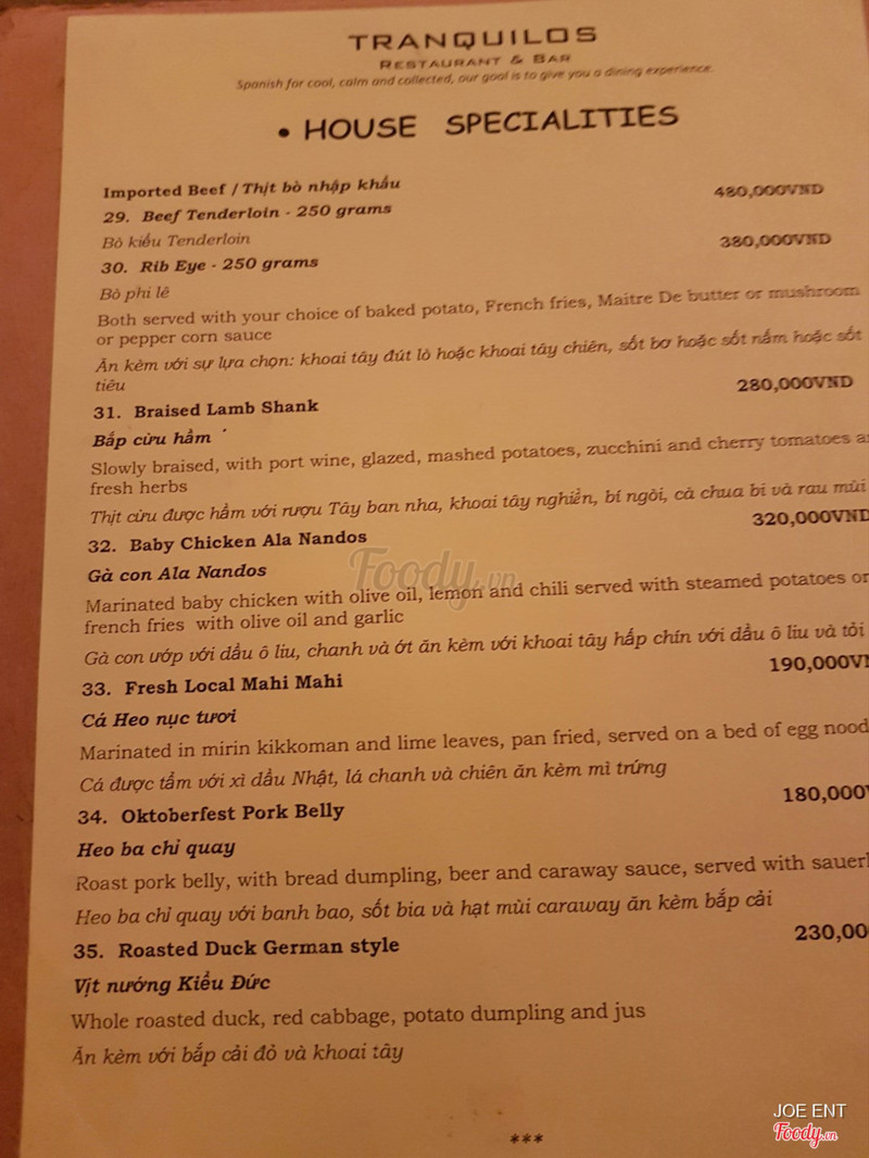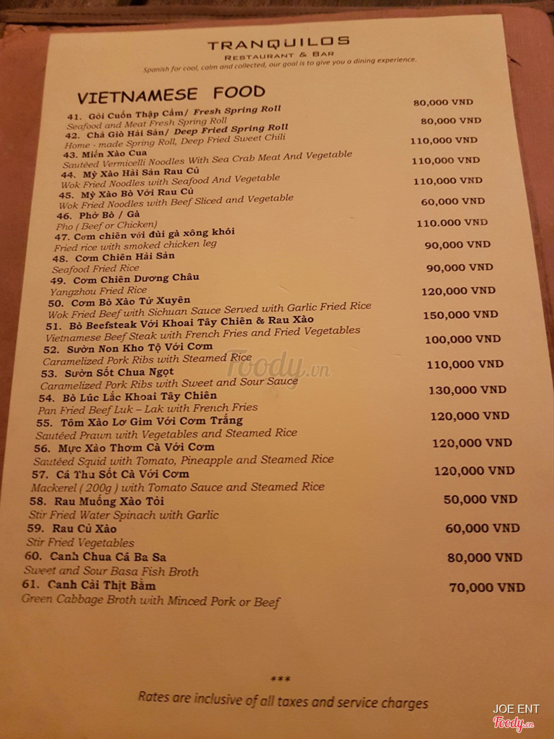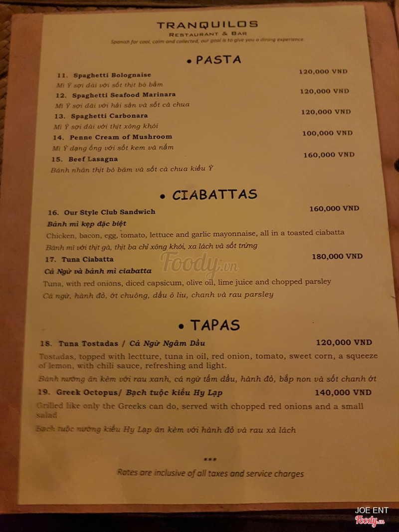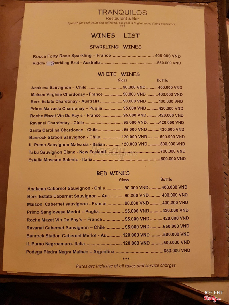 6.6Tranquilos - Restaurant & BarLần đầu tiên đi quán này, quán hơi tối, không gian hẹp, bài trí bàn ghế hơi sát nhau. Đồ uống nhìn chung ngon, tuy nhiên có món smothie matcha quán làm hơi ngọt. Với bình thường đi các quán khác lúc bê đồ uống ra thường kèm nước lọc hoặc nước trà, nhưng ở đây đợi xin mới đem ra. Giá hơi cao, tuy nhiên vì có nhạc sống nên cũng có thể hiểu được. Nhạc thì miễn bàn, quá hay luôn, có chú người tây hát toàn mấy bài hồi xưa. Nhân viên nhịêt tình, dễ thương. ...Xem thêm
