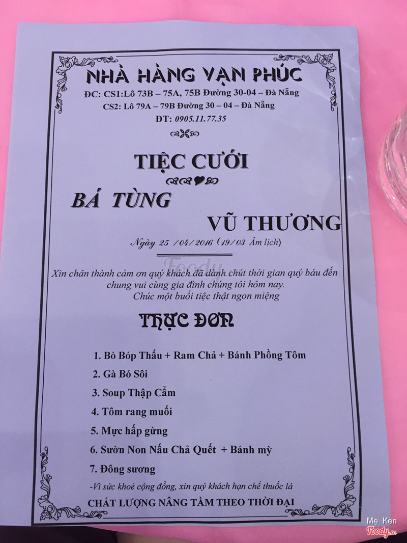 Nhà hàng tiệc cưới Vạn phúc. Không gian: Được xếp hạng những nhà hàng tiệc cưới dạng trung bình. Không gian ổn sức chứa tầm 500 khách trở lại. Thực đơn cưới có nhiều sực lựa chọn nhưng đánh giá về chất lượng thì đồ ăn của nhà hàng được chế biến khá ngon vừa vặn với khẩu vị. Món nào món nấy cũng đầy đặn và nhiều. Chương trình tiệc thì chủ yếu phụ thuộc vào sự lựa chọn của gia đình khâu tổ chức của nhà hàng tạm ổn. MC dẫn đám cưới bình thường không đặc sắc. ...Xem thêm
