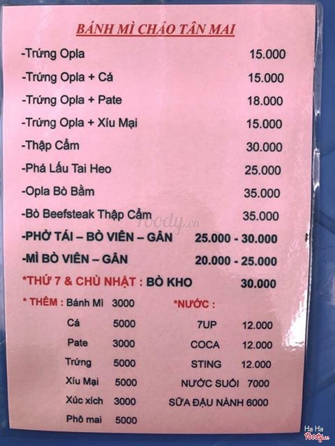 8.6Bánh Mì Chảo Tân MaiQuán này chuyên các món bánh mì chảo khá hấp dẫn. Menu nhiều lựa chọn. Nước sốt khá đặc biệt, đâm đà. Quán nằm trong hẻm Tân Lập đối diện xéo Bệnh Viện Đa Khoa Tân Mai vào khoảng 3,4 căn quán nằm bên tay phải. Quán có giao đi. Quán có cả phở tái và mì bò viên. MÌ TÁI 20k, MÌ BÒ VIÊN 20k, MÌ TÁI VIÊN 25k, PHỞ TÁI 25. Thêm Gân 5k ...Xem thêm