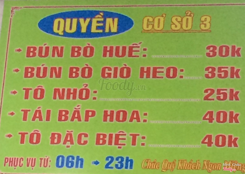8.4Bún bò thương hiệuBiên Hoà có nhiều quán bán Bún bò, Quyền cũng vậy. Quán gia đình mở bán cả ngày từ 6h sáng đến tận 23h khuya, nên các bạn thoải mái chọn giờ ghé ăn tại đây nhé, quán ở đường Trương Định (đường 4 cũ) khúc đầu bên Đồng Khởi. Giá tô nhỏ là 25k cho ai ăn ít và 35k cho tô thường, tô đặc biệt 40k rất to. Không gian khá rộng và mát, anh chủ còn chọn chỗ mát nhất cho mình ngồi, happy. Thịt bò nạm mềm và không có mùi, đĩa rau sống ăn kèm to, rau sạch xanh với ba loại: rau muống, hoa chuối và rau đắng. Ăn lần đầu và còn nhiều lần nữa sẽ quay lại quán khi muốn ăn bún bò. ...View more