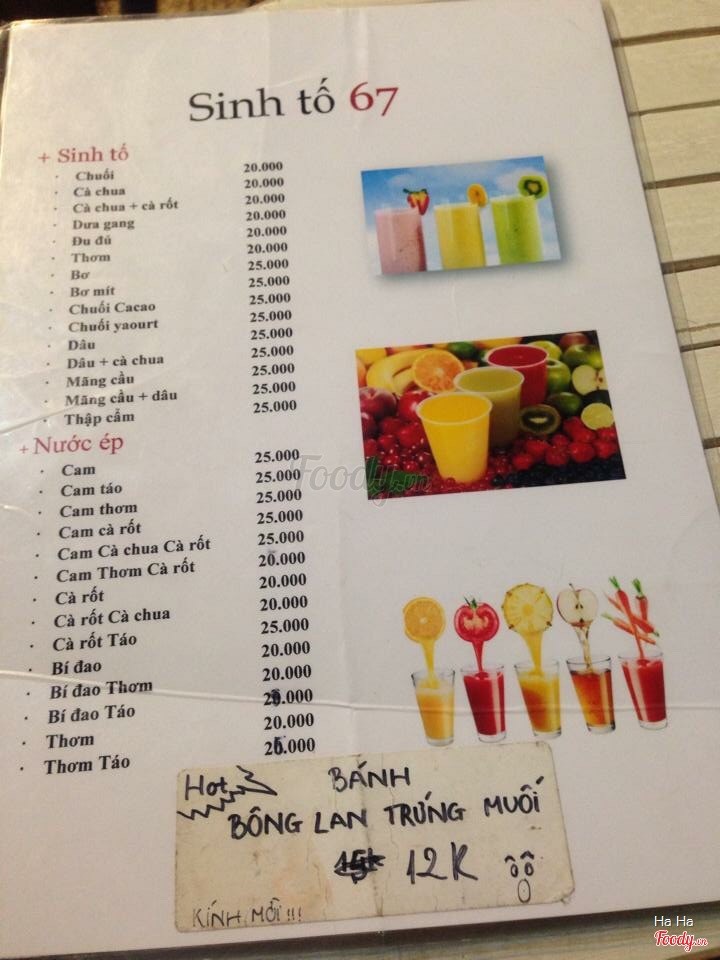 7.2Sinh tố 67Quán này mới mở, bán các loại sinh tố, trái cây lạnh ngon, nhưng phục vụ chậm quá. Chưa linh động . Khách tới mãi mới ra dọn bàn. K có ng giư xe nên tự trông xe mình nhé. Nằm ngay gần cục thuế. Cách vài chục mét. Giá 28k một phần trái cây sữa chua. Hơi mắc . ...Xem thêm
