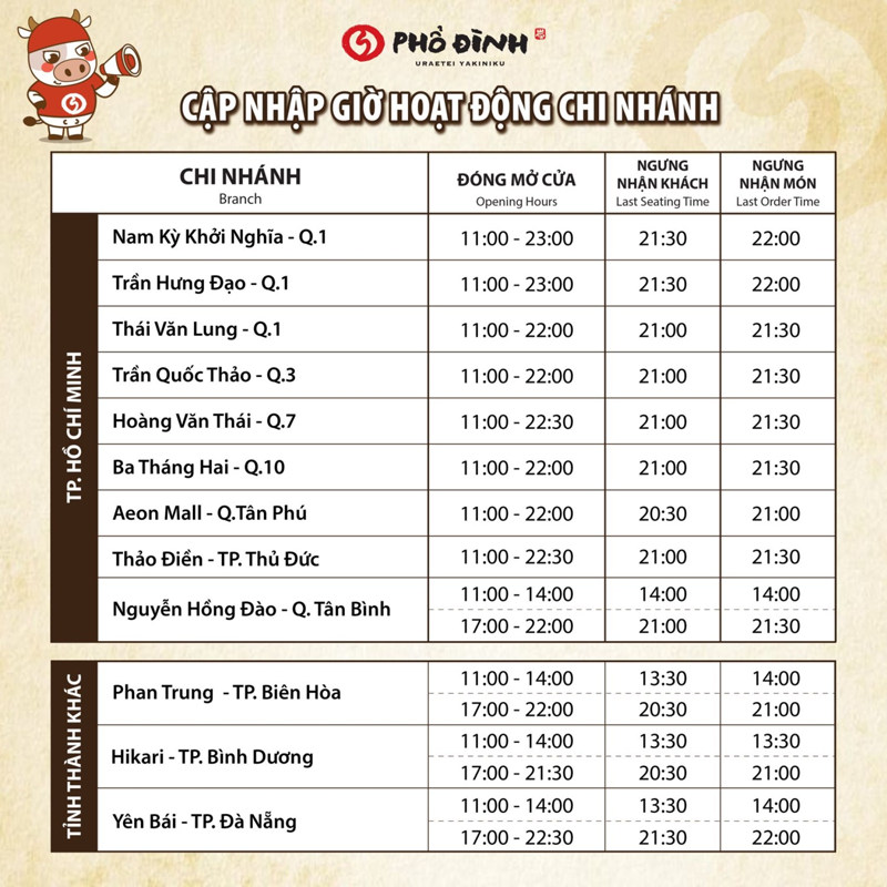 10[BẢN TIN GIỜ HOẠT TẠI PHỔ ĐÌNH]Phổ Đình bật mí tất tần tật các khung giờ tại nhà hàng để khách hàng có thể thoải mái ăn uống và trò chuyện cùng người thân, gia đình và bạn bè. ---------------------------------- 📞Hotline đặt bàn & chăm sóc khách hàng: 1900.633.302 bấm phím 1 👉 Website : https://www.uraetei-yakiniku.com.v n ...Xem thêm