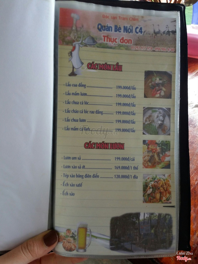 8.2Quán Bè Nổi C4Quán nằm sâu trong vườn quốc gia Tràm Chim, là một trong những điểm dừng chân cho khách tham quan. Lúc mua vé vào cổng thì đã được đưa menu quán để chọn rồi. Đa phần là các món đồng quê (chuột, lươn, cá lóc, cá trê,...) Cung đường mình đi ngắn, do tàu chạy bằng năng lượng khá chậm nên khoảng hơn một giờ đồng hồ mới đến trạm dừng chân này. Chắc do đói nên ăn thấy rất ngon 😂 Hai đứa gọi cá lóc nướng trui và ốc nướng tiêu. Ốc nướng tiêu không được đậm đà cho lắm, bù lại ốc nhiều. Cá lóc con khoảng 600gr, cá đồng, có trứng nữa (lần đầu ăn cá nướng có trứng á), cá ngọt thịt, thơm nức. Rau ăn kèm ít quá 😂, có cái lá sen non ăn chung cũng là lạ. Nước mắm me pha rất vừa miệng. 👍 Bill ghi cá lóc 150K nhưng thật ra con nhỏ nên có 100K thôi. Tổng cộng hết 190K cho hai đứa, no đó. Quán này nằm biệt lập sâu trong vườn quốc gia, không gian bao thoáng, bao hoang sơ 😘 Giá so với chất lượng thì cũng chấp nhận được, không quá chặt chém. ...Xem thêm