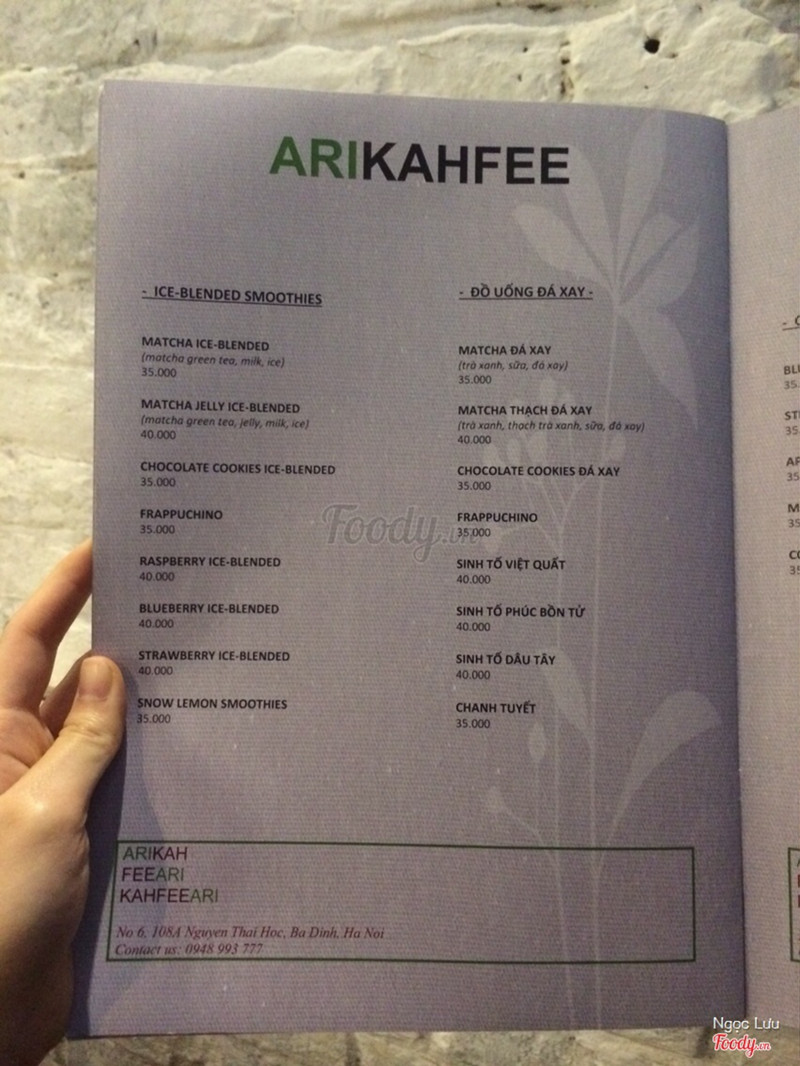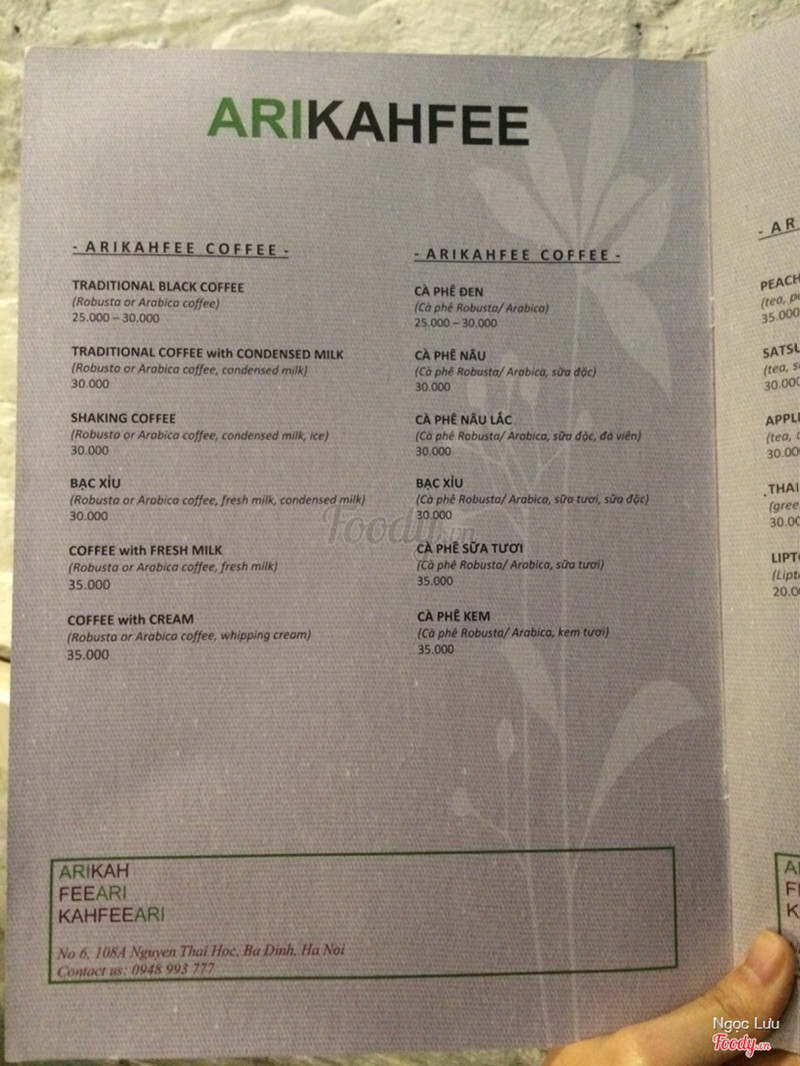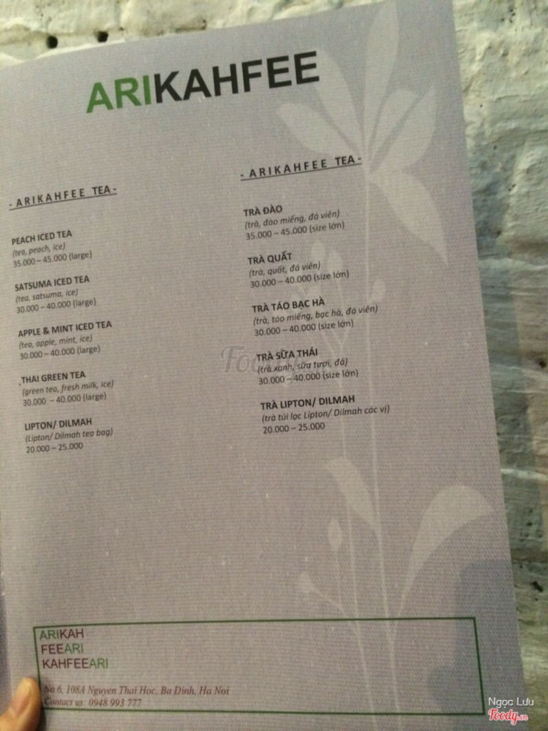 8.8Arikahfee CoffeeVô tình lướt lướt foody thấy quán nhìn khá đẹp, lại nằm trên tuyến đường mình hay đi nên lưu lại ngay, hôm nay có dịp đến check quán và là khách hàng đầu tiên của quán thì phải 😄 ✔️Vị trí: ngõ 108A thì cũng nằm ngay cạnh số nhà 108A thôi nên dễ tìm lắm dù ngõ rất nhỏ, nhìn qua còn tưởng cổng nhà. Chỉ lưu ý là Nguyễn Thái Học là đường 1 chiều, lại theo hướng giảm dần bên số chẵn tay phải về phía Bờ Hồ. Mà số 108A này gần như đoạn đầu của đường Nguyễn Thái Học luôn. Đoạn này gần Giảng Võ với Kim Mã í ạ. Nên đi từ đó đâm xuống sẽ chắc chắn k phải vòng lại. Vào ngõ cứ đi đến cuối ngõ là thấy quán ngay thôi ạ. ✔️Đồ uống: Mình k biết nên gọi gì. Phân vân mãi thì được bạn nhân viên giới thiệu cafe là điểm mạnh của quán, bên cạnh đó là trà nên mình gọi 1 cafe kem tươi và 1 trà táo bạc hà. ⭕️Cafe kem tươi có lớp kem bên trên ăn ngọt và ngậy khá ngon. Người yêu mình rất thích phần kem này và khen khá nhiều. Còn phần cafe bên dưới mình k biết về cafe nên k nhận xét được. Nghe nói đây là cafe "mộc", được xay gì đó ý. Thấy bạn người yêu bảo cafe thơm lâu, giữ được vị đậm đà, uống ngon. ⭕️Trà táo bạc hà là món mình siêu ưng. Lâu lắm rồi mới được uống trà táo bạc hà ngon thế. Từ hồi trà táo bạc hà ở The Kafe giảm chất lượng thì đến giờ mình mới được uống đúng 1 cốc trà táo bạc hà ngon. Trà uống cực kì thơm mùi trà, uống vào thấy rât thanh và mát, vị ngọt của táo, thanh dịu của trà cùng hương thơm thoảng thoảng và 1 chút the mat của lá bạc hà. Thực sự nên thử món này. Ngon lắm luôn đấy ạ. ✔️Giá cả: Giá cả trung bình như các quán cafe khác. Còn có cả size lớn và size nhỏ thường hơn kém nhau 10k thôi. Mà chất lượng có vẻ rất tuyệt nên mình thấy nó rẻ lắm í. Hôm nay tới còn được giảm ecard 20% cùng với check in tại quán thêm 20% nữa hay sao í. Mình phải trả có 45k thôi. ✔️Không gian: Dù nằm trong ngõ nhỏ và quán chỉ có 1 tầng thôi nhưng quán rất tâm lý khi bố trsi dãy ghế đệm dài. Ngồi đây rất thoải mái. Đặc biệt các bàn tuy ở cùng 1 phòng nhưng được đặt theo nhiều hướng quay lưng nhau thành ra lại khá riêng tư nhé. Có chỗ ghế ngồi cạnh cửa sổ nhìn ra vườn nhỏ bên ngoài băt mắt với màu xanh của lá cây nữa. Thực sự quán rất thích hợp cho những buổi hẹn hò, tâm sự, hay đi 1 mình cũng cực kì hợp lý và k phải ngại. ✔️Nhân viên: Có bạn nhân viên nữ order và pha chế trông rất nhẹ nhàng và tư vấn rất nhiệt tình, chu đáo, vào quán tiếp xúc bạn này làm mình thấy thích quán ngay từ đầu. Có bạn nhân viên nam bê đồ cho bọn mình trông cũng thân thiện và nhiệt tình nữa. Anh chủ thì lúc đầu hơi kiệm lời. Sau thanh toán quen hơn thì thấy cũng chu đáo và đương nhiên lac cũng nhiệt tình không kém rồi 😂 Hơi tiếc vì quán k có đồ ăn. Giá có bánh ngọt hay đồ ăn vặt nữa thì đúng là điểm 10 luôn. ...Xem thêm
