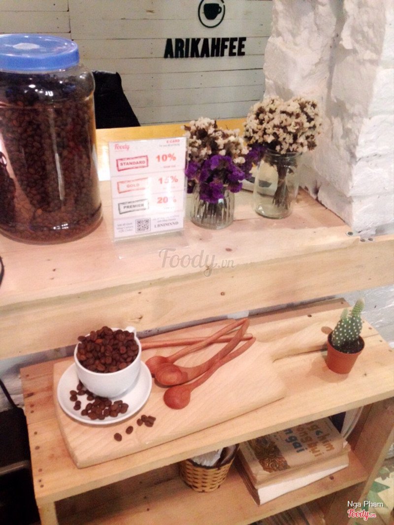 7.2Góc yên tĩnh!✔ Rất ngạc nhiên khi tìm được một quán cafe trong ngõ nhỏ này. Đến Arikahfee mình gọi 2 đồ uống trà quất và cafe nâu đá 👉 Cafe ở đây nghe anh chủ nói thì là cafe thật, có chọn lọc do anh có đam mê vs cafe. Mình uống thì cũng thấy rất ngon dù ko phải là một người ưa thích cafe. Cốc cafe thơm, uống vào thấy ngọt vị sữa, có một chút chua nhưng lắng lại sau cùng là vị đắng của cafe. 👉 Trà quất ngọt nhẹ, chua mát, nhìn rất đẹp mắt vs màu cam và từng lát quất thái mỏng. 1 cốc trà quất thế này là quá đủ cho 1 buổi ngồi tán dóc vs bè bạn rồi 👏👏👏 ✔ Giá cả phù hợp, lại còn là cafe thứ thiệt nên mình khá ấn tượng. Trà quất 30 còn cafe nâu 25k. Cửa hàng có khuyến mại e-card nên bạn nhớ dùng nhaaaa ✔Không gian ở đây rất thích nha. Thoáng mát, ko hề bí bách dù ko gian hơi bé vì có cửa sổ to hướng ra ngoài vườn. Có đầu tư decor mang lại cảm giác của thời xưa cũ với những chiếc máy điện thoại bàn, sách, tranh ảnh và đâu đó những hạt cafe ✔ Nhân viên phục vụ, anh chủ rất đáng yêu, còn nhắc mình dùng thẻ nữa thích ghiaaaa T.T ...Xem thêm
