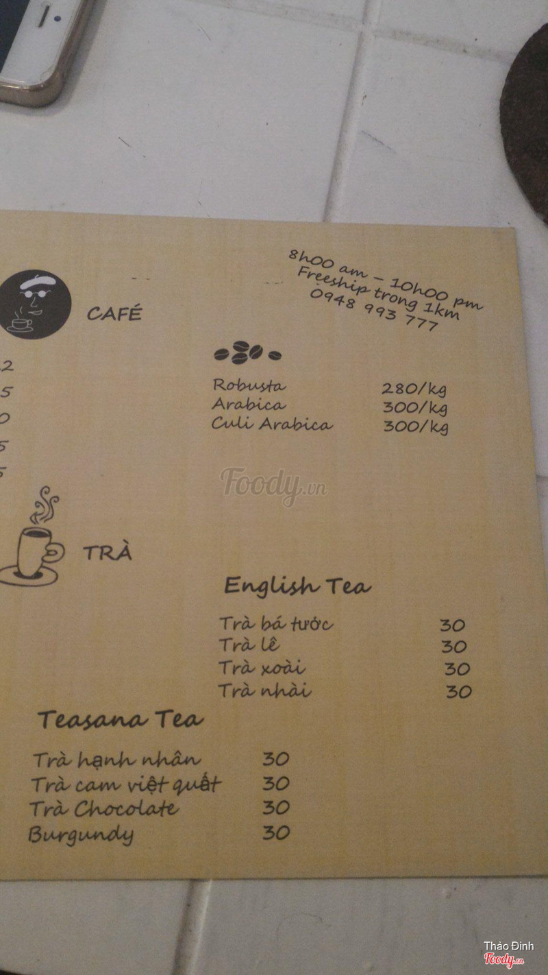 8.4Đồ uống dc chắt lọc, ít loại nhưng rất ngonMenu ít đồ nhưng đc đầu tư kỹ nên rất ngon. Cafe xay hương vị khác hẳn cafe thông thường. Quán yên tĩnh, ngõ vào hơi nhỏ nên phù hợp cho ai có sở thích vừa làm việc vừa nhâm nhi ly cafe lắc. ...Xem thêm