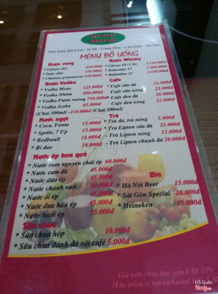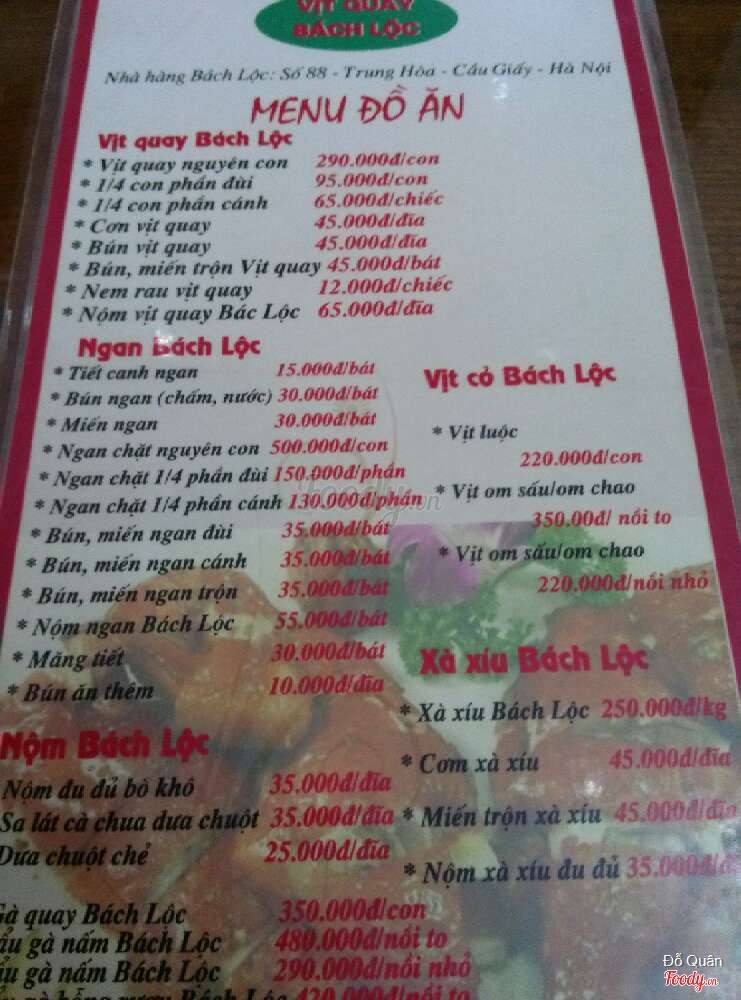 6.0Có hai Bách Lộc rồi nhé!Mình biết cái này số 86 rồi, nhưng mà, số 88 cũng là Bách Lộc rồi nhé, tầng một cửa riêng, nhưng tầng hai đánh thông, đẹp lắm! Địa chỉ bây giờ chắc phải đổi thành: Số 86-88 Trung Hòa rồi :) Ưu điểm: Quán dễ tìm, nằm mặt đường Trung Hòa, lại mặt tiền sơn đỏ, biển xanh lá cây nhìn rất nổi, nói chung là đập ngay vào mắt. Không gian rộng, bàn ghế gỗ cao vừa tầm. Tầng hai rất đẹp, rộng rãi, có ánh sáng dễ chịu lại thêm tường kính cho view tuyệt vời! Tuy nhiên, tầng 1 lại xấu, sơ sài như quán cơm bình dân, quả là một trời một vực. Vịt quay ngon, mềm và ngọt thịt, không hề có mùi tanh, và cũng không giống kiểu quay ta hay thấy ở chợ. Làm đồ nhanh, có cả số gọi đồ tận nơi, không lo mưa bão. Quán có wifi, nhưng không có trông xe. Nhược điểm: Có chút phân biệt đối xử, một chút, giữa khách ăn sang chảnh và khách cùi cùi như mình. Không phải tất cả, nhân viên có người cũng rất lịch sự, đàng hoàng. Vấn đề là, nhìn người ta ngồi tầng hai đẹp quá, ta ngồi chỗ.xấu, hơi chạnh lòng. Trang trí tầng một cũng sơ sài, có như không, nhìn xấu. Giá cả thì đắt, vịt 300k, ngan 500k, giá đấy ăn ở Triệu Việt Vương được rồi, ra Trung Hòa làm gì? ...Xem thêm