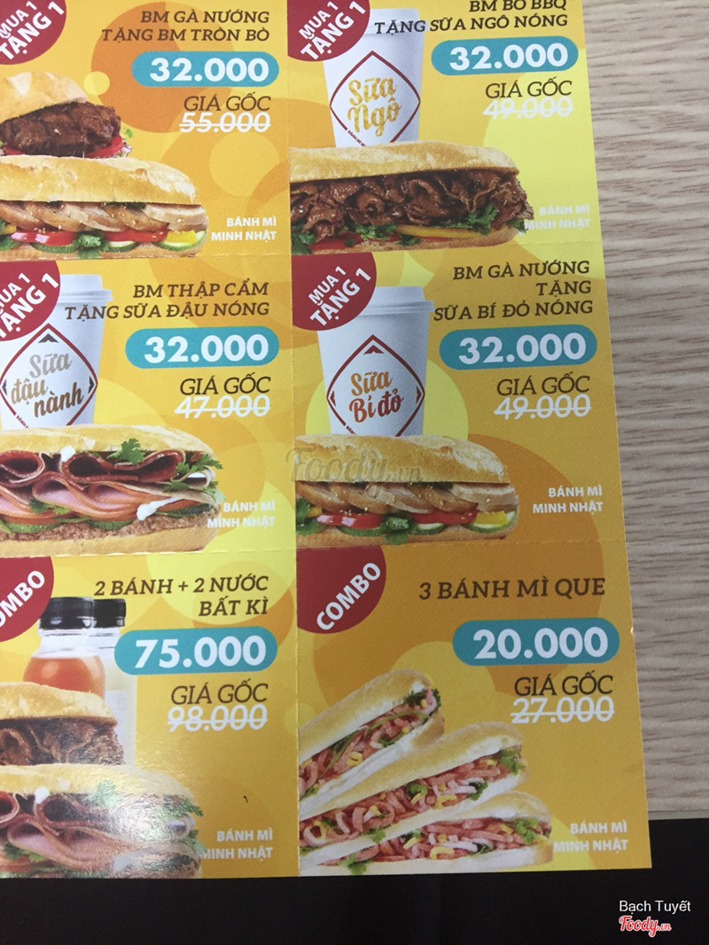 8.0Khá ngonĐợt này lười nấu ăn mà Minh Nhật có nhiều giảm giá với deal 1đ nên đặt suốt. Mình thấy bánh khá ngon, ngon nhất là bánh bò phô mai, còn các bánh khác thì thực sự không khác gì các quán/gánh bánh mỳ khác. Chuẩn bị cũng khá nhanh, tầm 5-10p là xong. Tuy vậy nếu không có giảm giá thì chắc mình sẽ không mua, vì với cái giá gốc quá cao và việc thực sự bánh không có nhiều nhân như ảnh món ăn đăng lên, cũng như nước trong combo cũng quá ngọt đường thì giá gốc đó không đáng. Mình toàn đặt qua Foody/Now nên không biết không gian, dịch vụ như thế nào, xin phép để mặc định điểm 8 cho các mục này. ...Xem thêm