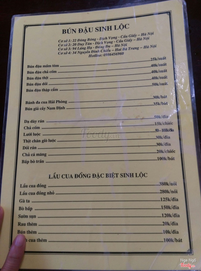 7.4Món ăn dễ ăn ngay cả ngày đôngTưởng chỉ mùa hè mới thèm ăn bún đậu, ai ngờ mùa đông còn thèm hơn vì có thể ăn bún đậu chấm giả cầy với giá chỉ 45k/ suất hoặc lẩu riêu cua bắp bò giá khoảng 350k/ nồi cho 4 người ăn. Điểm cộng là quán sạch, đẹp, phục vụ món bình dân theo kiểu nhà hàng. Điểm trừ là buổi trưa không có chỗ đỗ ô tô, phải gửi dưới hầm toà nhà 88 láng hạ mất 25k/2 giờ. Xe máy đỗ miễn phí. ...Xem thêm