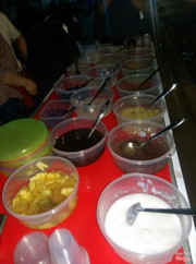 6.6Chè Tự Chọn - Chùa Láng🐘 Chè tự chọn đây. Rẻ thôi rồi 10k/cốc. Đối diện sân bóng chùa láng ý, bán tầm chiều. Chỗ ngồi vỉa hè thôi, quán không đông quá nên ghế trông không bừa. 🐘 Chị bán hàng sẽ đưa cho bạn 1 cái cốc (giống cốc ăn chè bt ý chứ chẳng bé cx chẳng to) có thêm chút đá rồi, ít thôi. Xong muốn ăn gì tự múc. Chè cx kha khá loại, nhưng không có bưởi, hơi đặc nên khó múc. Mình lấy mỗi thứ 1 ít, mà ko có dừa khô. 🐘 Tièn nào của nấy, chán :)) Toàn mùi bột năng, chè bị đặc do cho quá nhiều bột năng mà. Mình múc cả chè chuối cốm ngô trân châu đậu xanh đỏ đen... Ăn vào không có vị đặc trưng, chỉ có vị bột năng nấu cùng đường )) nhưng thôi rẻ nên chấp nhận chát lượng này . Ăn chán nên chụp linh tinh chứ cx quên chụp cốc chè ...Xem thêm