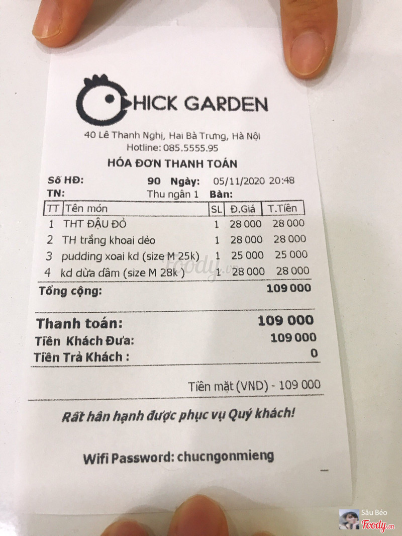 7.8Chick GardenQuán này có khá nhiều cơ sở. Ngồi trong quán được khoảng 10 bàn nhỏ. Các bạn nhân viên thì trẻ và nhiệt tình. Đồ ra nhanh. Mình thấy về cơ bản đồ khá ok, đồ mình ăn là chè và tào phớ. Chứ mình chưa có ăn súp thanh cua. Tào phớ trắng trong, mịn, ăn mát cổ họng lắm, vị ngọt nhè nhẹ. Chè khoai dẻo ăn cũng được. ...Xem thêm