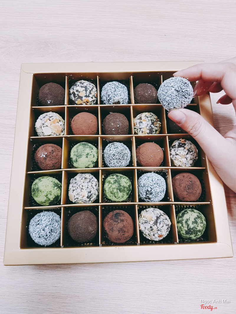 7.0Chocolate Addiction ShopĐợt valentine vừa rồi các chị em văn phòng được tặng sớm một hộp chocolate này này Về hình thức thì ổn bao bì tuy đơn giản nhưng mình thích đơn giản nên ok, choco kiểu viên truffle đựng trong hộp, hộp nhỏ có 14 viên đủ các thể loại vị và đủ mày sắc Thực ra về cơ bản bên trong giống nhau chỉ có chocolate đen vị ăn ngậy và hơi ngọt so với vị của mình, đắng nhẹ, bên ngoài có phủ choco hoặc dừa hoặc matcha hoặc hạnh nhân hoặc cacao Túm lại chất lượng và hình thức ok. ...Xem thêm