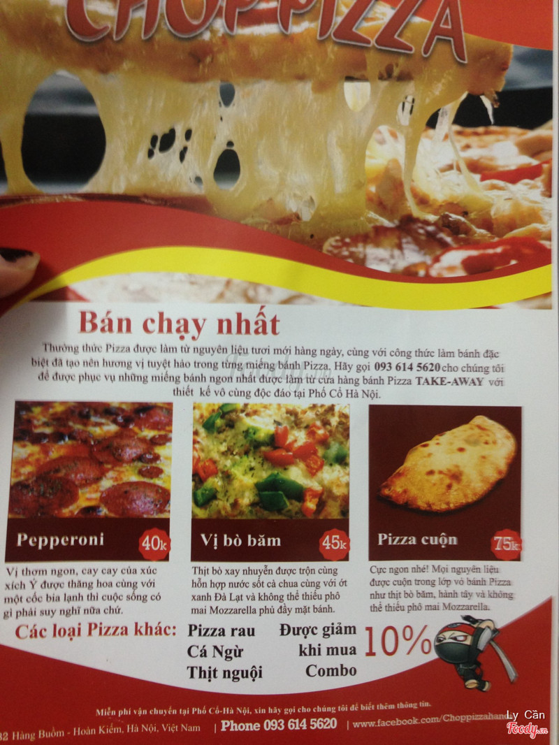 7.4Chop Pizza - Hàng BuồmQuầy bánh bé xíu xiu ngay giữa phố cổ, không có chỗ ngồi lại nên bắt buộc là mua mang đi rồi, buổi sáng cái quầy còn nhoi ra ngoài trộng ngộ ngộ. Pizza ở đây bán theo miếng hình chữ nhật to hơn lòng bàn tay 1 chút, muốn xắt nhỏ thế nào tùy thích nhé :) Có khoảng 4-5 vị thì mình thử được 3 vị, mua sẽ được quay lại bằng lò vi sóng, may mà ăn cũng ra gì. Tính ra thì hơi đắt so với mua cả bánh lớn như ở peps, domino,..Có combo bao gồm nước tiết kiệm hơn chút đỉnh. Nhân viên thân thiện, nhiệt tình. ...Xem thêm