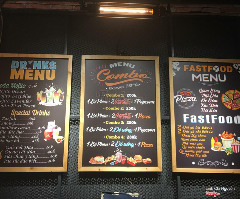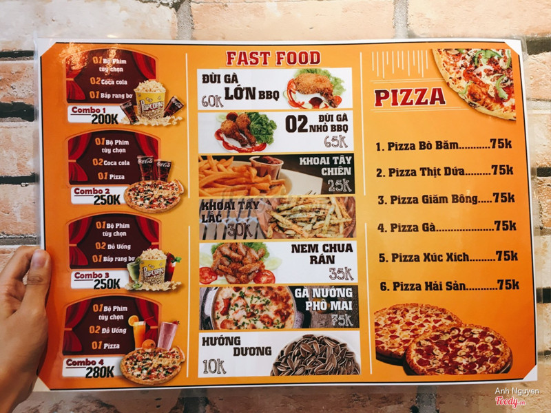 8.8Hẹn hò cafe phim siu lãng mạn 😍Quán này mới mở gần Coopmart chỗ ĐH Hà Nội nè. Trước mình không ấn tượng mấy quán cafe phim lắm tại nghĩ ko gian thường xấu và đồ ăn chán. Được rủ đi quán này xong phải nghĩ lại )) Không gian tầng 1 khá nhỏ, cảm tưởng như quán cf thôi. Tầng 2,3 trở lên mới là các phòng chiếu phim. Phòng nào cũng lát sàn gỗ, có điều hoà, ghế sofa trông siêu hịn. Màn hình chiếu cũng to nữa. Không gian ấm áp thoải mái chắc chắn sẽ là nơi hẹn hò lí tưởng của các cặp đôi 😉 Về đồ ăn thì ngon hơn mình nghĩ nhiều. Menu siêu đa dạng, có pizza, gà phomai, gà chiên, nem chua rán,... Tất tần tật những món ăn vặt đình đám mà giá lại rất rẻ. Đi ăn theo nhóm chia ra tầm 50-60k/ng là no căng luôn. Gà nướng phô mai chỉ 75k mà ngập cheesee. Pizza cũng bình thường nhưng size khá vừa ăn xong đã thấy no luôn rồi )) Menu đồ uống cũng đa dạng lắm. Mình ấn tượng nhất bé trà sữa 3 tầng. Sữa thơm và ngọt, uống thích lắm. Giá đồ uống dao động tầm 25-60k, phần lớn toàn 30-40k/món. Hợp lí với chất lượng 💪🏻 Điểm nhấn của quán chắc chắn là các combo đi kèm phòng chiếu phim. Mình ưng nhất combo 1 phim - 2coca - bỏng là 200k. Rẻ hơn đi rạp mà còn riêng tư hơn hihi. Hoàn toàn recommend cho các cặp đôi đang tìm chỗ hẹn hò gần khu Hà Đông - Nguyễn Trãi 😘😘 Nhân viên nhanh nhẹn nhiệt tình, mình đến cái là ra dắt xe hộ liền. Bình thường các bạn muốn đặt phòng xem phim cứ thoải mái gọi điện đặt chỗ trc là okay~ ...Xem thêm