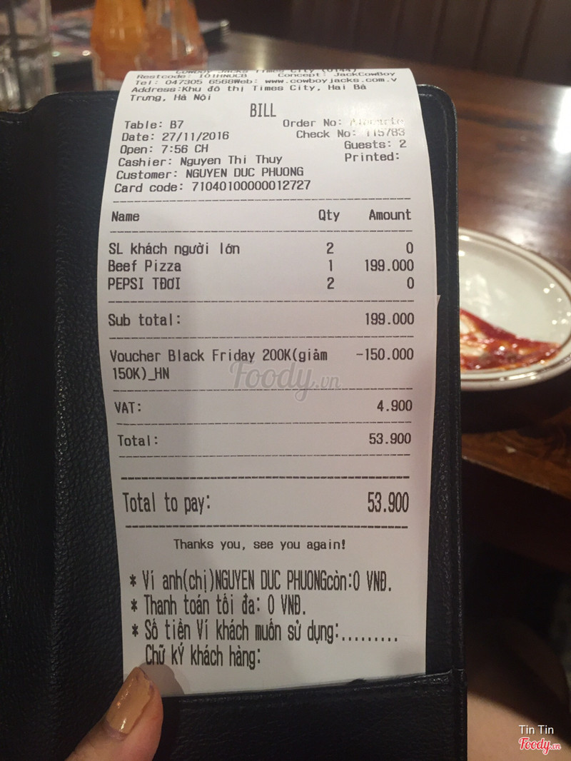 7.8Cowboy Jack's American Dining - Times CityĐi ăn cùng bạn từ lâu rồi mà bây giờ mới viết review về cowboy jack tại times city. Mình rất ít khi đi vào times city vì nó cũng khá xa nhà mình, minh khai so với giảng võ. Bình thường là mình hay chọn ăn cowboy jack ở tây sơn cơ. Chất lượng có vẻ không khác gì nhau, rất ổn định. Nói chung là với cowboy jack thì mình chưa bao giờ cảm thấy thất vọng về chất lượng đồ ăn ở đây dù là pizza, salad, steak hay pasta, rất hợp miệng mình :)) nhân viên chuyên nghiệp, lịch sự. Có thể sẽ quay lại! ...Xem thêm