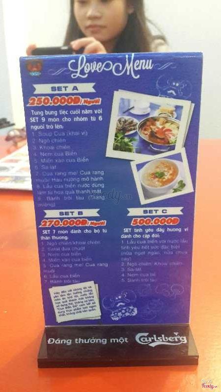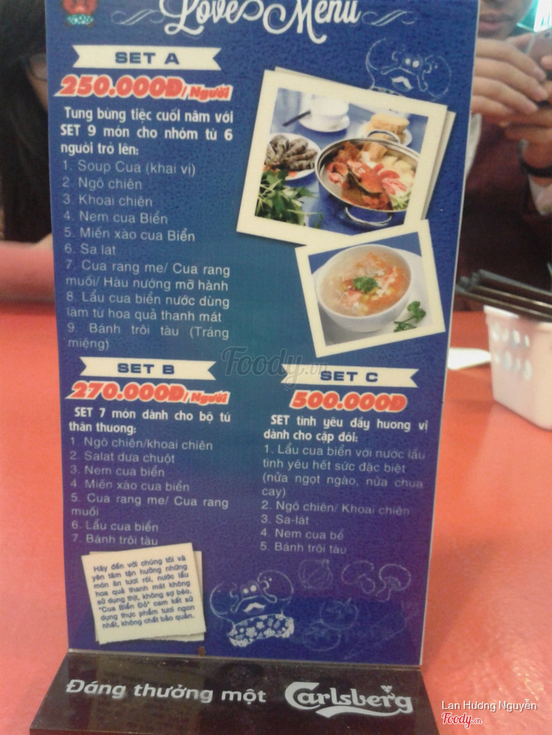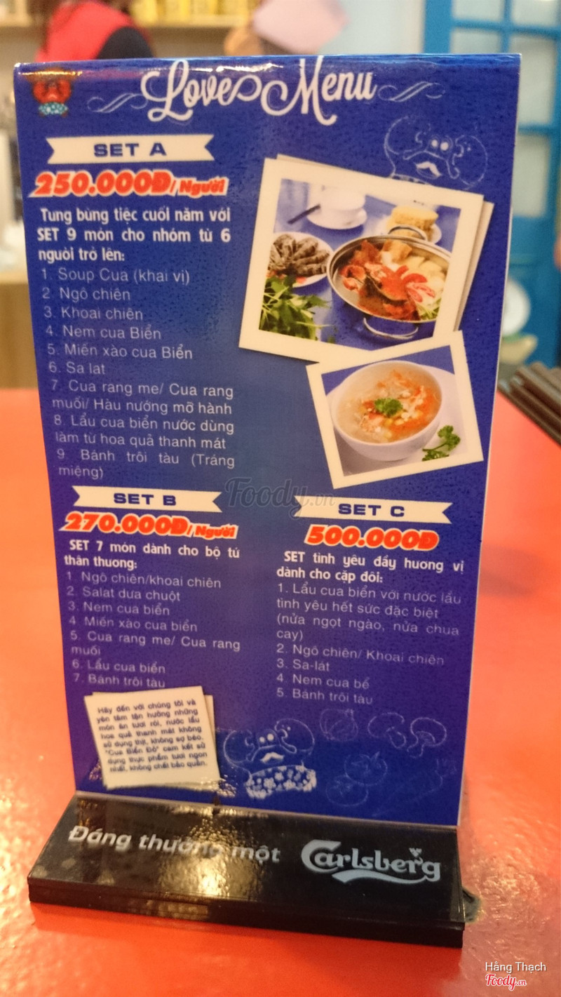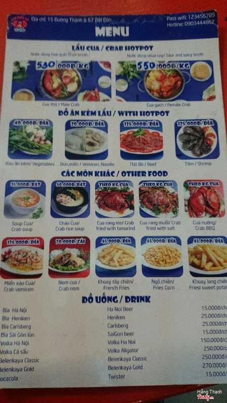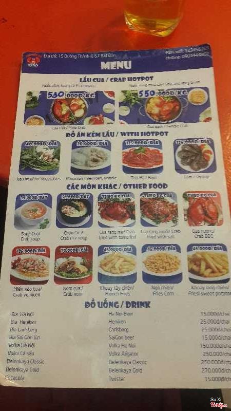 7.6Cua Biển Đỏ - Đường ThànhKhông gian đẹp, được thiết kế rất trẻ trung với màu xanh da trời - trắng chủ đạo rất phù hợp với những buổi tụ tập bạn bè, ăn gia đình, hẹn hò. Món chủ yếu ở đây là cua biển. Trong thời gian chờ thì có khoai môn chiên để nhâm nhi. Mình dùng thử lẩu cua có nhận xét như sau: nồi nước dùng được chia làm 2 ngăn 1 bên là nước dùng hoa quả rất ngon, vị ngọt thanh dễ chịu 1 bên là nước dùng chua cay cũng khá ổn. Mình rất thích cua ở đây, cua nhiều thịt, thịt cua dai và rất chắc, nem cua biển vỏ hơi cứng nhưng nhân khá ngon. Miến cua biển cũng rất ổn. Nhân viên phục vụ khá chu đáo. Điểm trừ là súp cua hơi loãng. Giá cả mình thấy rất phù hợp với chất lượng ...View more