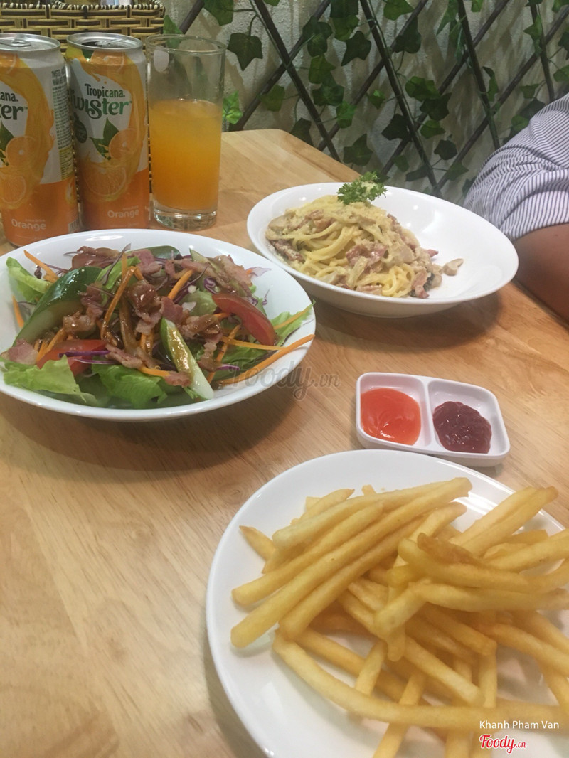 7.2Cũng đc- Quán nằm phía Hoàng Ngân bên kia đường chứ kfai Hoàng Ngân phía Al Fresco nha! - Quán hơi nhỏ, tầng 1 nóng nên hầu như k ngồi đc. Tầng 2 rộng rãi hơn, có điều hòa mát, phong cách sv, đơn giản - Mình gọi 2 loại steak bò Mỹ 150g (99k), 1 mỳ Ý sốt kem, 1 salad thịt nguội. Mỗi set Steak đều có khoai chiên (fries) và salad ăn kèm rồi. Steak mình thấy ăn khá ổn, sốt (có 3 loại sốt thì mình thử đc sốt BBQ và sốt tiêu; sốt tiêu ngon, sốt BBQ bt). Mỳ Ý sốt kem nấm (hình như) cho cả thịt hun khói vào luộc hay sao đấy hoặc có 1 miếng thịt nào đó mình cảm giác ăn như thịt luộc vậy mất cảm tình vô cùng :( - A chủ quán rất nhiệt tình, giúp mình bê xe đẩy em bé lên tầng. Còn bạn NV chưa chuyên nghiệp lắm, chắc do mới hehee. Không hỏi steak dùng loại nào (medium hay chín), mà auto cả 2 suất là medium luôn, cũng suýt thì quên k hỏi sốt loại nào đấy ))) ...Xem thêm