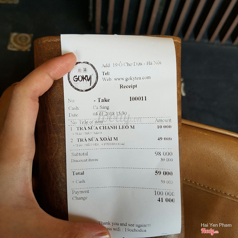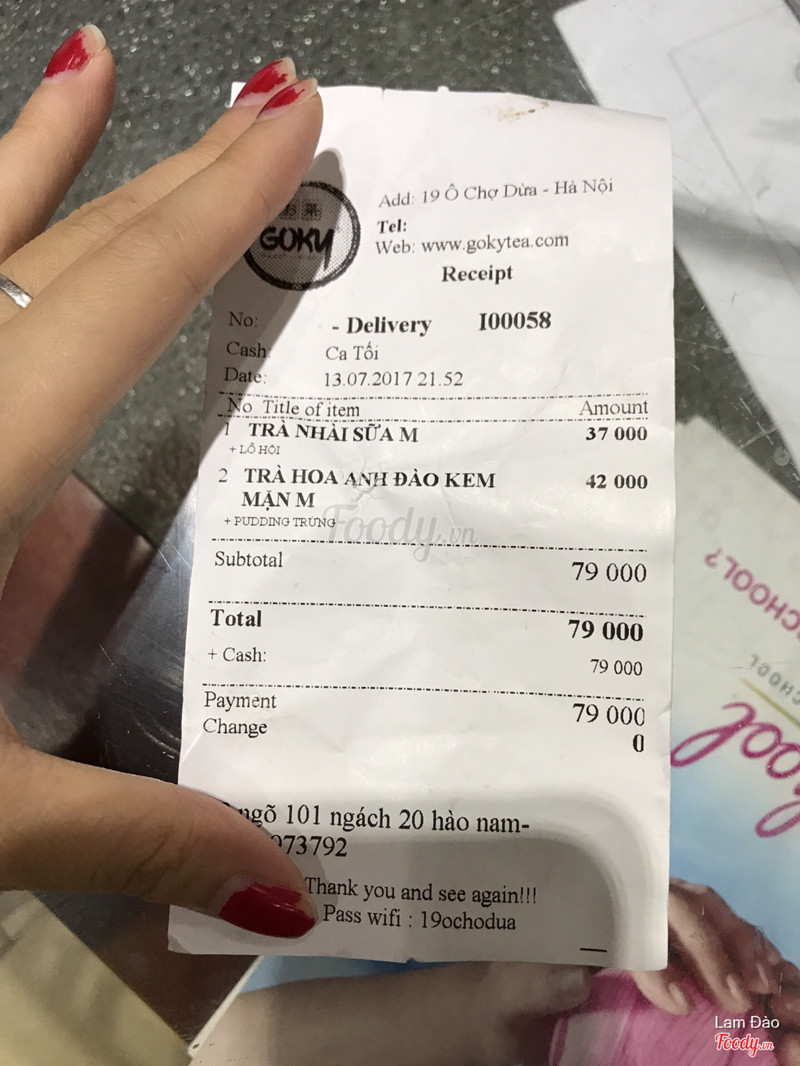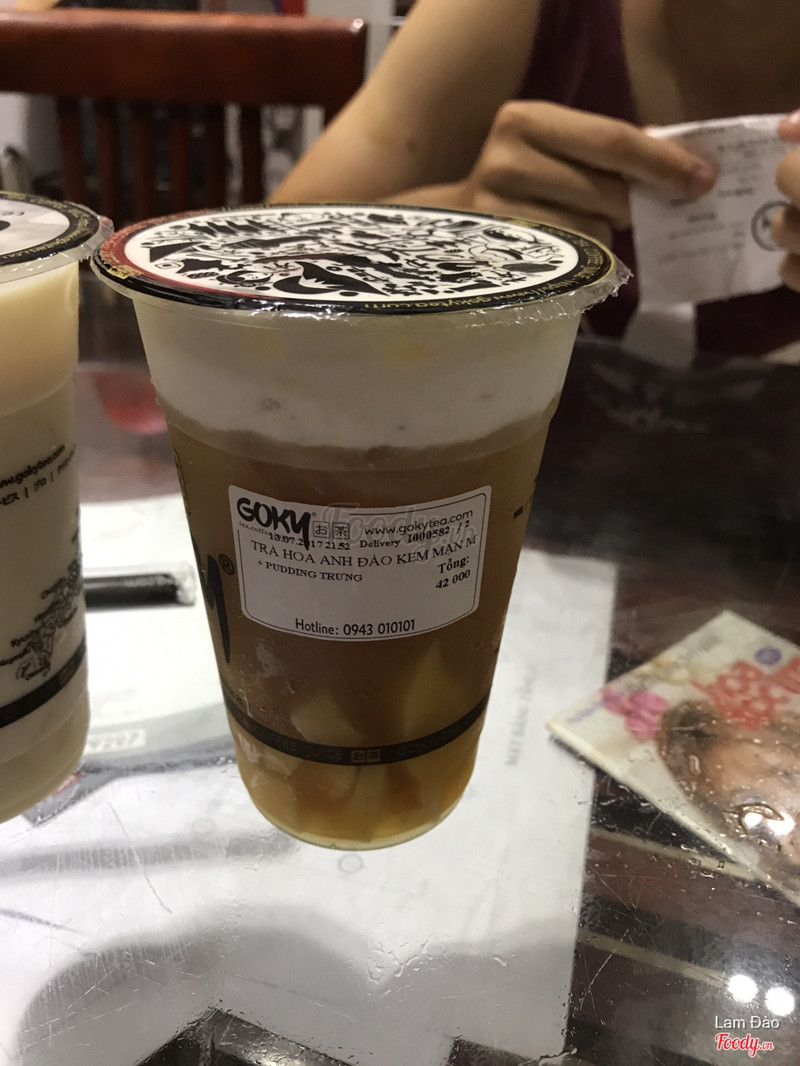 3.8Goky - Tea Coffee & Juice - Ô Chợ DừaHôm nay mình gọi deli code 35% 2 cốc thêm chân trâu vs pudding, sau đó bạn ship có gọi nói trân châu hết nên đổi sang thạch mà k nhắc j đến pudding. Đến lúc nhận thì chỉ còn 1 topping, cũng ko có hoá đơn nên ko hiểu là 2 lần thạch hay j nhưng nchung nhìn ảnh mng cũng thấy là chả thấy topping đâu. Về vị thì ko hiểu trà nhật khác trà đài loan hay sao mà vị rất chán. Hồng trà ko rõ vị và có 1 chút vị chua, kem sữa đánh ko đều nên vẫn cảm thấy lặn cặn ko mịn, cảm giác như ăn sữa bột trẻ em. Trà kiwi đỡ hơn nhưng vẫn ko ngon bằng các hãng khác. ...Xem thêm