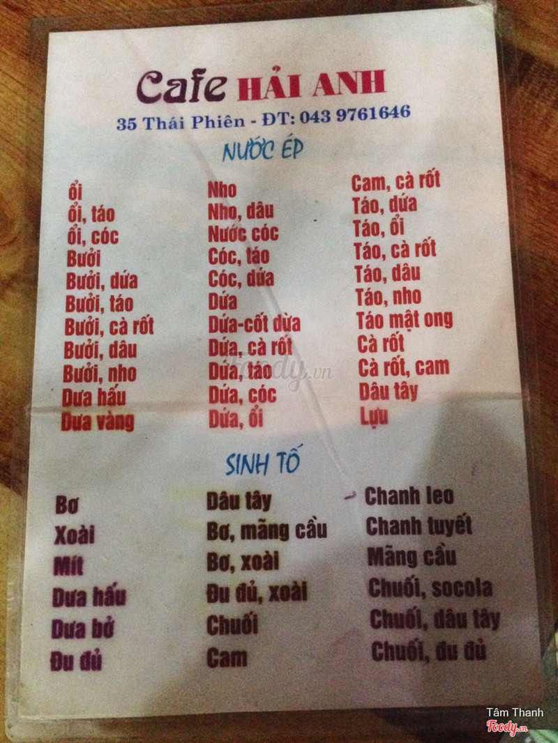 7.0Hải Anh Cafe - Thái Phiên- quán cf nằm đối diện vincom, buổi tối ngồi siêu đông, mát mẻ mà toàn đc ngắm nam thanh nữ tú thôi:)) - nhân viên phục vụ nhanh nhẹn, tư vấn nhiệt tình luôn:)) gọi xong đồ ra cũng nhanh nữa. - menu quán có đầy đủ các thể loại cf, nước ép, sinh tố, chè cháo các kiểu, giá tầm 25-40k. Tuy nhiên m chỉ thích uống nc ép hoặc sinh tố thôi, như nước ép cóc vs ổi thơm mà k bị ngọt hay chua quá, sinh tố chuối dâu tây cũng ngon và lạ miệng. Tuy nhiên sữa chua mít nhiều mít, nh sữa chua nhưng mà chẳng có thạch chân trâu gì cả 😢 mà m thì là con nghiện chân trâu, chè sầu riêng thì siêu ngọt, tuy nhiên sầu riêng thơm nhiều ngậy (vs bạn nào ăn đc vs ngửi đc mùi sầu riêng thôi nhé 😚😚) ...View more