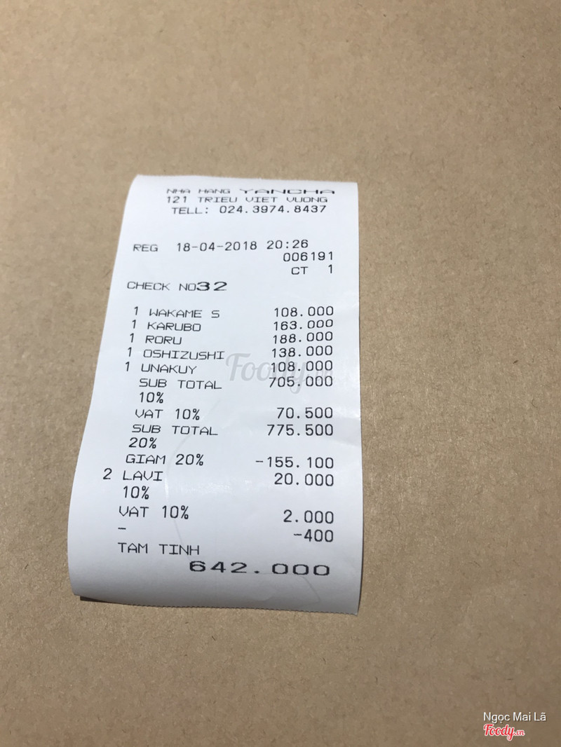 6.6Izakaya Yancha - Ẩm Thực Nhật Bản - Triệu Việt VươngNghe quán này lâu rồi nên lần mò đến Quán không có không gian riêng biệt hẳn mà các gian nhỏ phía ngoài có rèm che. Ánh sáng hơi tối chút nhưng mấy quán nhật hầu như đều vậy nên quen rồi Phục vụ nhanh và khá ngoan nhưng quy định ở đây là ngồi xổm khi nghe khách gọi món. Thế nên lúc mình đang ngâm cứu thực đơn bạn nhân viên ngồi xổm ngay cạnh khá ngại Đồ ăn không đặc biệt ngon, chỉ tạm được. Salat rong biển không giòn lắm lại hơi chua Sushi lươn ăn ổn, cơm dẻo thơm Mấy món còn lại hổng ấn tượng luôn. Được cái kem ngon :x Hoá đơn tiếng nhật, check bạn phục vụ cũng không nhớ nên hơi khó khăn. Mình đặt qua table now đc giảm 20% nhg không tính đồ uống, tráng miệng nên cũng không giảm đc mấy. 1tr8/ 3 người thấy không đáng lắm. ...Xem thêm