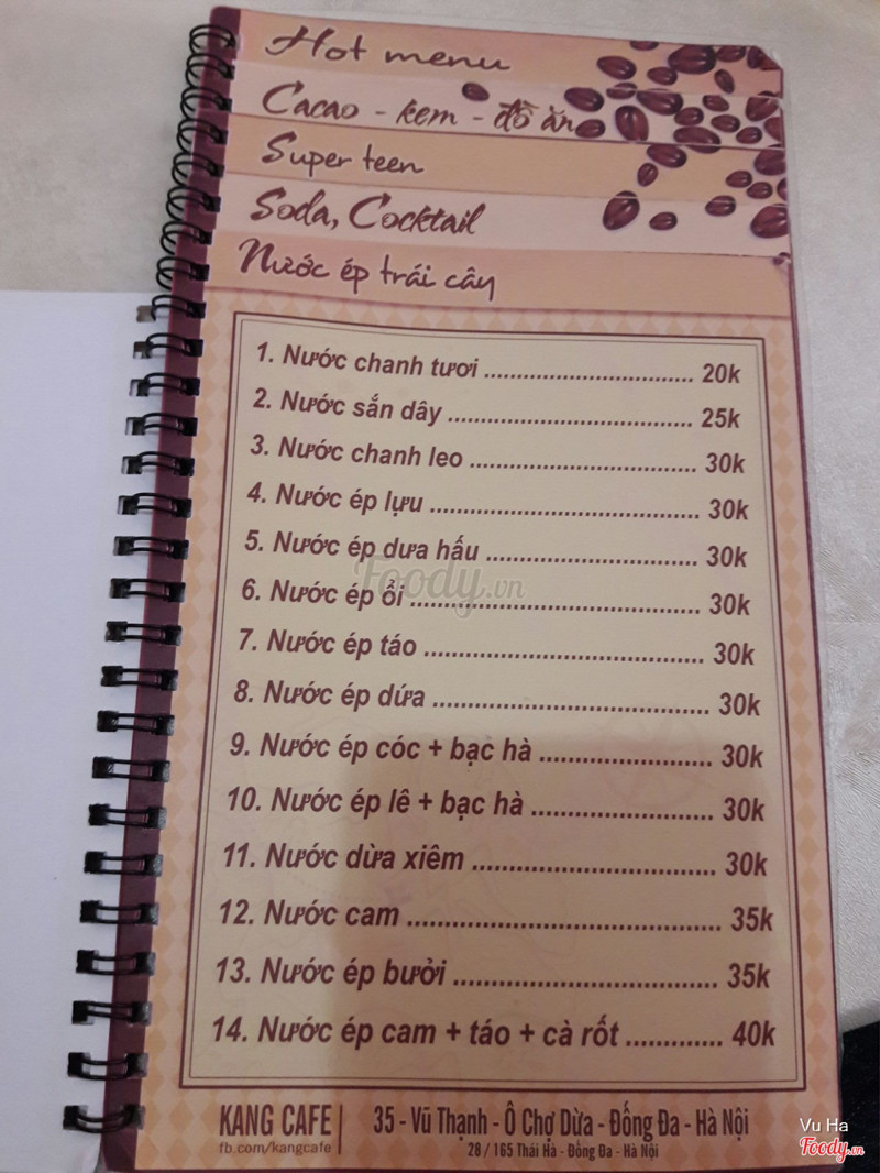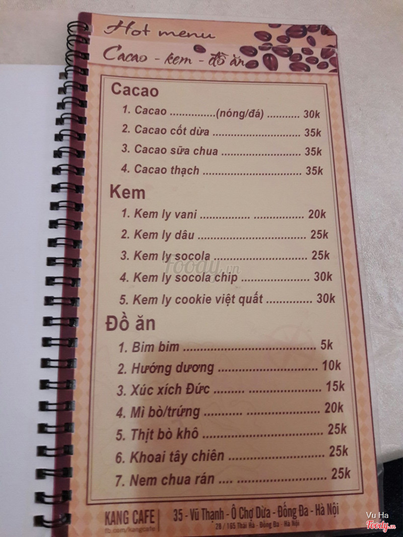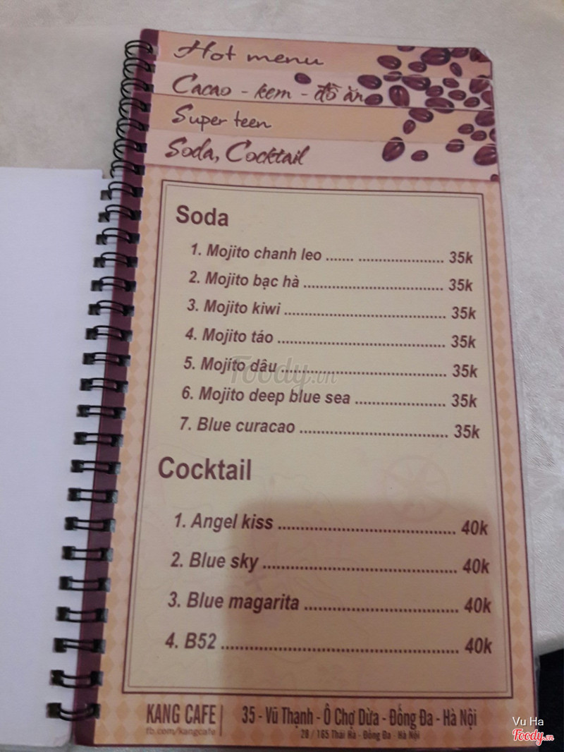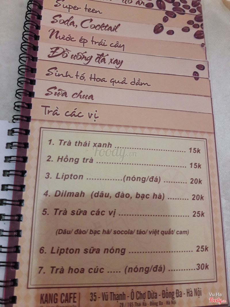 7.4Kang Cafe - Vũ ThạnhHôm đó có việc ở gần đường Vũ Thạnh nên ghé vào quán nghỉ trưa, đường này cũng không nhiều quán cafe. Quán nhỏ xinh , trang trí đơn giản, tạo cảm giác ấm cúng, menu quán thiết kế rất thông minh, bạn định uống sinh tố hay trà, cafe... thì nhìn ra trang đó một cách dễ dàng chứ không như đa số các quán khác phải đọc hết quyển menu mới tìm ra món mình muốn uống. Đồ uống ở đây cũng khá rẻ, tầm 15k trở lên. Mình và bạn mình gọi sữa chua đánh đá và sữa chua thavhj , uống cũng khá ok. Phục vụ niềm nở. ...Xem thêm