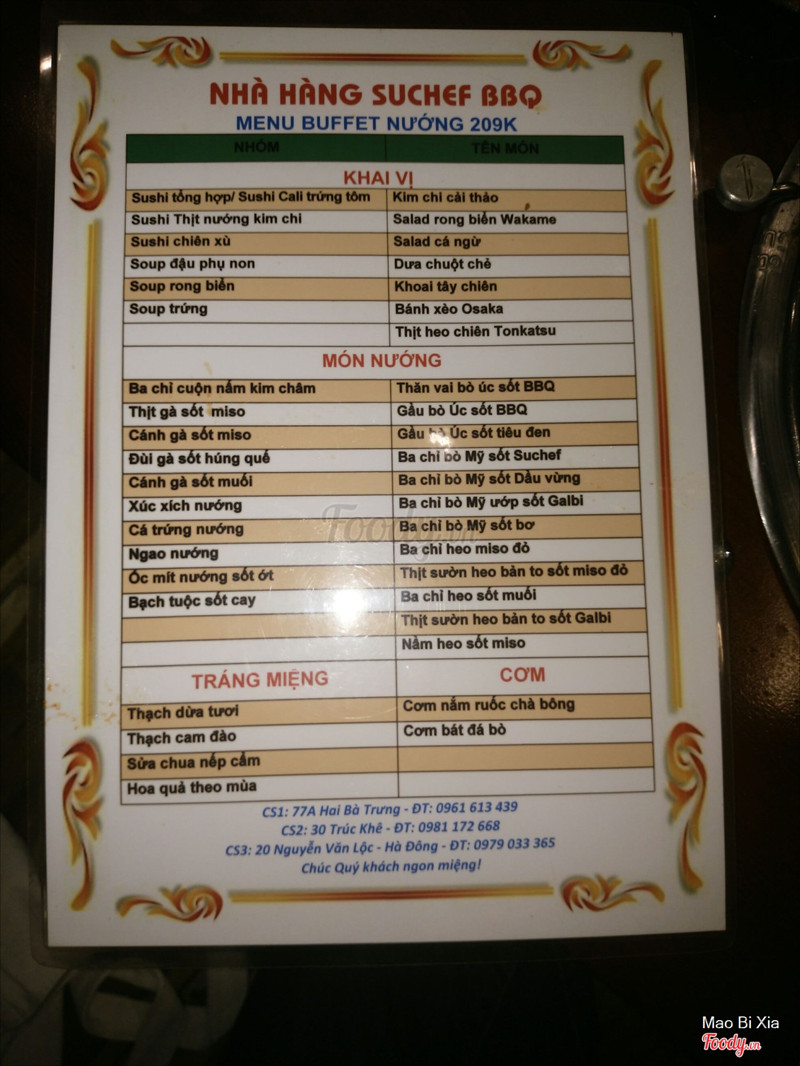 8.6Ăn được, giá rẻMình và bạn mình đi ăn ở đây tối hôm kia. Vốn cũng không biết quán này đâu, định ăn ở chỗ khác, nhưng lúc đặt bàn bên đó mới biết bên kia đang sửa chữa, nâng cấp nên tạm nghỉ, vội lên Foody search tìm quán nướng khác gần nhà thì phát hiện quán này. Theo như lên page quán tìm hiểu đây là cơ sở 3 của Suchef, cũng mới mở nên còn áp dụng ưu đãi khai trương. Bọn mình có like page + share post về ưu đãi trước đó + đặt bàn trước ít nhất 2h so thời gian ăn nên có được hưởng ưu đãi, giá ưu đãi là ăn set nướng còn có 149k (bình thường như hình là 209k), khá là rẻ. Về đồ ăn, đây là quán nướng phong cách Nhật nên đồ ăn đều kiểu Nhật, đồ khai vị là các món salad, súp Nhật và sushi, đồ nướng là các món ướp sốt miso hoặc BBQ. Đồ nướng chủ yếu là thịt và thịt thôi, bọn mình có gọi cả ngao và bạch tuộc, tuy nhiên cả ngao và bạch tuộc đều khá bé, nên cảm giác ăn không đã bằng thịt, nhất là bạch tuộc vì bé quá nên không có độ giòn sừn sựt kiểu ăn sụn như bạch tuộc trưởng thành. Còn về thịt thì ăn ngon, mình thích nhất thăn bò và đùi gà, cái món đùi gà húng quế kia, ăn thơm và ngon lắm, mình rất thích. À, ngoài ra bọn mình còn được hưởng ưu đãi là được tặng thêm cá hồi bọc bạc nướng và nấm kim châm bọc bạc nướng nữa nha, cái này không nằm trong menu buffet nướng, nhưng ăn ngon lắm. Ngoài ra cũng nằm trong ưu đãi khai trương, bọn mình được uống Coca free, và ăn kem tráng miệng free nha (kem không nằm trong menu Buffet). Về không gian, quán không quá rộng nhưng cũng không quá chật hẹp, hệ thống hút mùi khá tốt, ít nhất hôm mình và bạn mình đi ăn thì không thấy bị có khói ngập trong nhà lúc nướng. Về thái độ nhân viên, mình chưa ăn ở cơ sở khác không rõ, nhưng ăn ở đây thấy nhân viên nhiệt tình lắm, gọi cái gì là ra cái đó rất nhanh, đồ ăn trên bàn vơi đi chút là có bạn nhân viên đến hỏi có cần gọi thêm không. Nói chung là nhân viên nhiệt tình, nhanh nhẹn, bên bếp chuẩn bị đồ khá nhanh. À quên, quán ngoài món nướng thì còn có lẩu Nhật nữa, mà bọn mình không ăn lẩu nên chỉ gọi nướng, set lẩu + nướng đắt hơn, nhớ không lầm là 249k, đang ưu đãi còn 179k hay 199k gì đó. Quên mất nữa, quán này nằm ở đường Nguyễn Văn Lộc, đối diện chéo siêu thị Coop Mart Hà Đông nhé, rẽ vào đường Nguyễn Văn Lộc, đi qua Coop Mart nhìn sang trái là thấy ngay, dễ tìm lắm ý, có bác bảo vệ xe cũng nhiệt tình, dễ thương lắm. ...Xem thêm