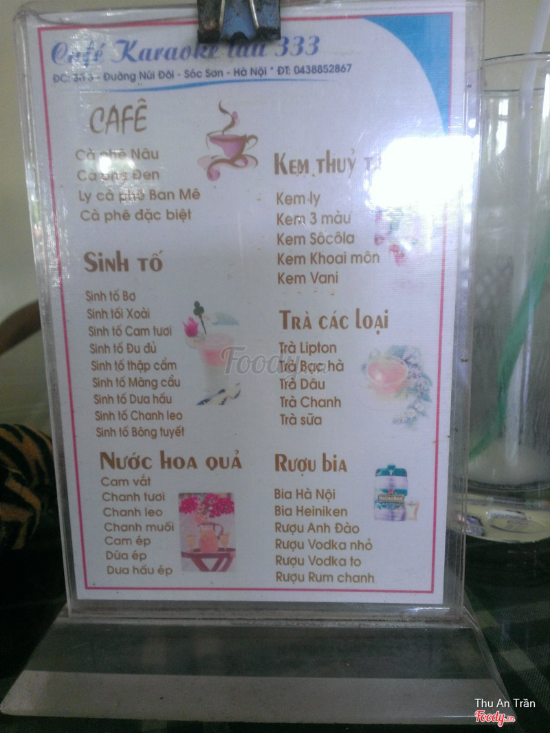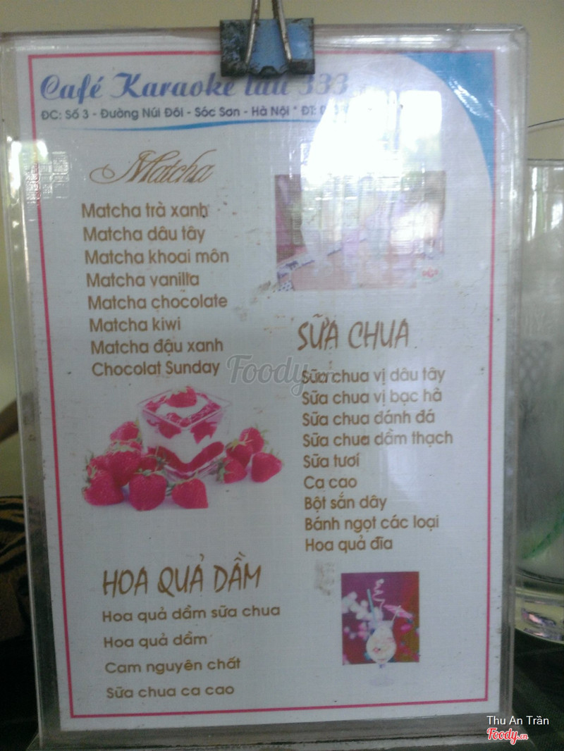 3.6Cafe, sinh tố, quán hát, quán ăn ...Quán vị trí đẹp, gần đường trục chính, gần các cơ quan hành chính công quyền và trường học. Đồ uống tạm ổn, phục vụ hơi chậm (còn nhân viên bưng đồ chưa biết mời khách) Tối cuối tuần (T7, Cn) nhiều đối tượng thanh niên ngổ ngáo tụ tập nên không gian không phù hợp với quán cafe lắm. Tầng 1 - quá hát karaoke Tầng 2 - cafe ăn uống ... Nếu tìm một nơi giải trí đơn thuần (không quá chú trọng không gian) thì Cafe lầu 333 là địa điểm đáng lưu tâm tại khu vực Sóc Sơn. Tuy nhiên khi ngồi ở nhưng nơi có nhiều thành phần phức tạp như ở đây, các bạn chú ý đồ đạc tài sản cũng như thái độ đúng mực tránh gây sự chú ý dẫn đến bị xô sát. ...Xem thêm