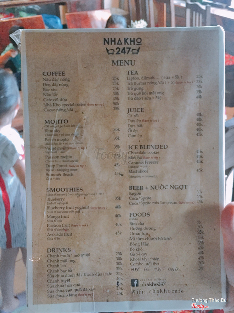 ✅Mình search trên Foody để tìm quán cafe khu Văn Quán, định bụng xem quán nào có nhiều vote good thì vào. Ban đầu thấy có Tomato cafe nên bấm chỉ dẫn đi theo. Tới lối rẽ thì ở đầu có trà đạo An Lạc, rẽ trái đi vào thì thấy Nhà Kho 247, chả thấy Tomato đâu. ✅Search tiếp xem Nhà Kho trên google thì thấy ra một loạt các bài viết, review ổn. Thế nên chốt hạ gọi cho mấy đứa em qua đây. ✅Ấn tượng ban đầu là quán khá cũ kĩ, không nổi bật. Nhưng vào bên trong thì không gian lại rất ấn tượng. Nào tranh cổ động, bàn ghế gỗ thập niên 90, máy đánh chữ, cốc tráng men, điện thoại, tivi đen trắng, quạt con cóc..v.v... Như là mình đang ở nhà mình lúc còn học lớp vỡ lòng vậy❤️ ✅Nhân viên của quán thì ban đầu có vẻ thấy khó gần. Sau mình nhận ra có thể các bạn ấy như vậy để cho khách thấy tự nhiên, chứ nếu cung phụng quá thì lại giống như các quán cafe khác, tự nhiên mới đúng như đang ở nhà. Nhưng nụ cười niềm nở vẫn được đánh giá cao, Nhà Kho nhỉ? 😊 - Đồ uống: cả mấy chị em mình đều gọi sinh tố Việt quất và sữa chua việt quất. Sinh tố việt quất ngon hơn, vị đậm hơn. - Giá cả phải chăng. 🚩Điểm trừ là có một nhóm thanh niên ngồi góc trong nói chuyện khá to, rồi toàn văng đ, v, l, đm.v.v.. Mình nghe thấy khó chịu, nhưng quan trọng hơn là có con gái mình mới 5t đi cùng nên rất sợ con bắt chước 😞 Mong bạn nào đọc review này thì rút kinh nghiệm "cái miệng nó xinh thế, chỉ nói điều hay thôi! " ...Xem thêm