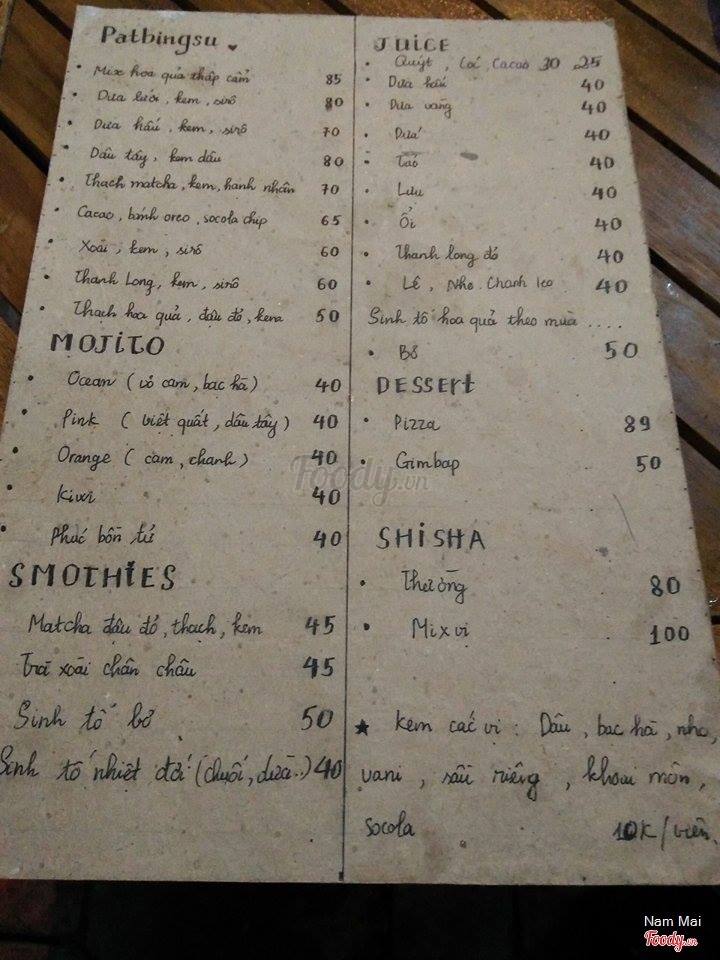 7.4Patbingsu Dessert - Quán ThánhBingsu ở đây khá lạ so với các quán khác. Nhiều vị khá lạ. Hôm mình đi hết đậu đỏ nên không được thử. Tiếc. :( Viên kem phía trên khá mịn và tươi, ăn rõ vị ngon lắm. Hoa quả đều là hoa quả tươi hết, nhất là thanh long ruột đỏ ấy ngon lắm. :x Ấn tượng nhất là bingsu chocochip oreo ấy, ngonnn. Nhiều chocochip ăn sướng. :( Giá cả tầm 70-80k 1 bát thôi. :3 Anh chị chủ quán nhiệt tình thân thiện, không gian hơi bé nhưng khá ổn, bên ngoài có bàn ngồi vỉa hè khá cute. :3 ...Xem thêm