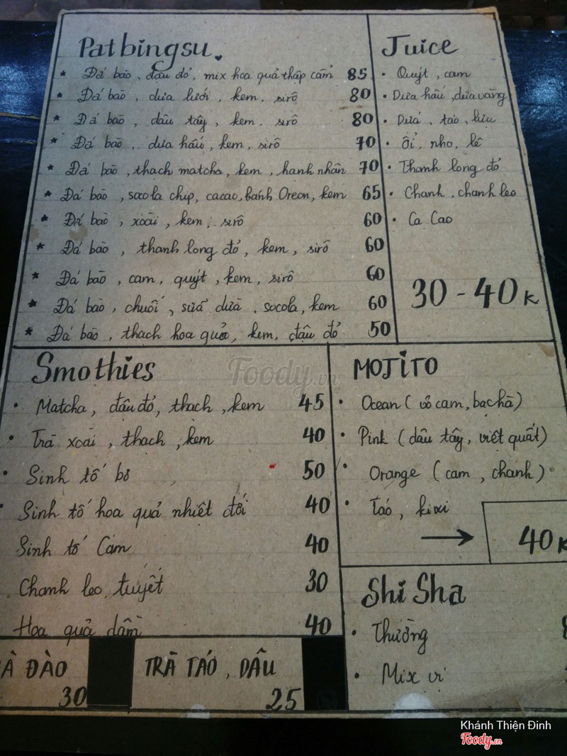 1.8Patbingsu Dessert - Quán ThánhXem quảng cáo trên foody thấy review ổn nên đi ăn,ko ngờ quá thất vọng Quán tên là Patbingsu mà thực đơn ra lại chỉ toàn loại bingsu,ko hề có đậu đỏ. mình gọi loại có thạch matcha,hạnh nhân mà ko có một chút hạnh nhân nào, hỏi nv thì đc trả lời là thay đổi thực đơn, thay đổi thì ngay từ đầu phải bảo khách luôn chứ lại để khách chọn món trog thực đơn cũ bao h Nói chug là sẽ ko bao h quay lại, giá đắt đỏ mà ko chất lượng tẹo nào ...Xem thêm