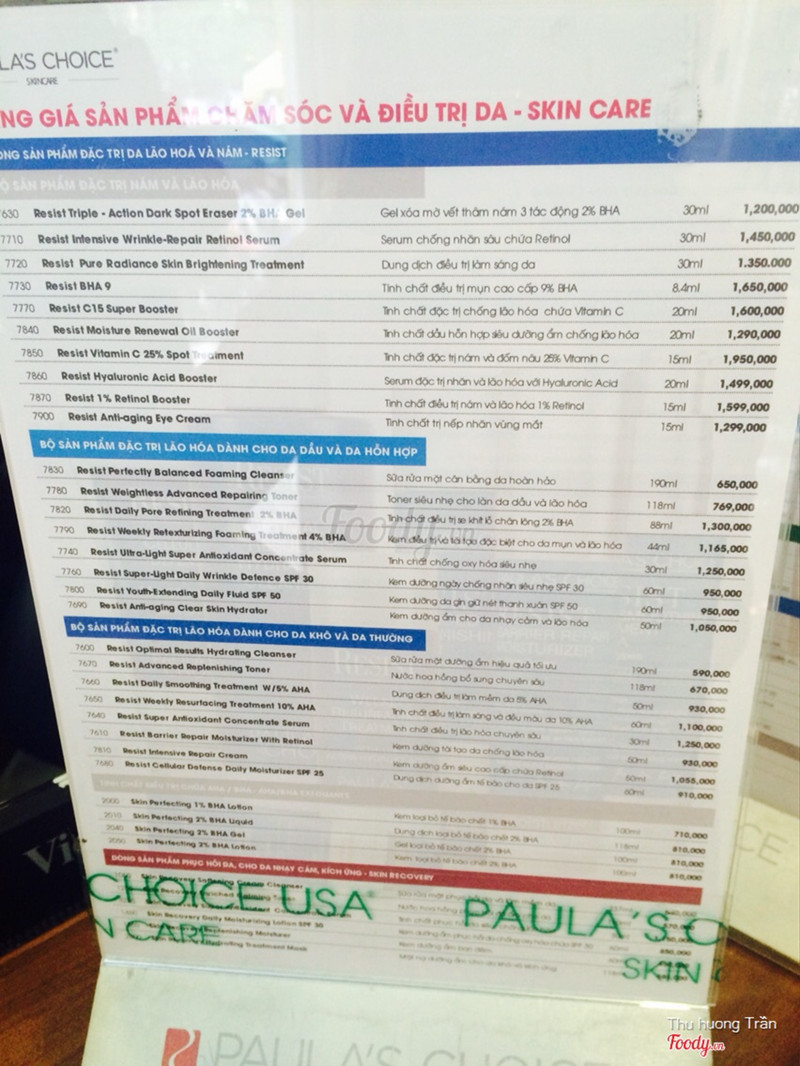 Mình đến đây là để mua bha 2% liquid paulas choice. Giá store có cao hơn xách tay nhưng sẽ đáng tin cậy. Vì bha là 1 lọ nắp vặn dễ bị mở khui ra r mà cta k thể biết. Hơn nữa mua hàng ở đây có máy soi da tốt. À phải la máy siêu âm da chứ nhỉ. Biết đc nếp nhăn, mụn ẩn, rất nhiều thứ. Đợt mình mua sản phẩm đc tặng kèm matxa trải nghiệm sản phẩm. Nvien cực kì chuyên nghiệp. Đánh gia cao những spa mat xa tay mà có sức nóng tư tay ấm nthe. Rat thích chỗ nào bán sản phẩm kem matxa ntn thi minh có thể mang sản phẩm tới và họ dùng cho hoặc ko cân cũng đc :dXem thêm- Đây là nhận xét từ Thành Viên trên Foody, không phải từ Foody Corp. -