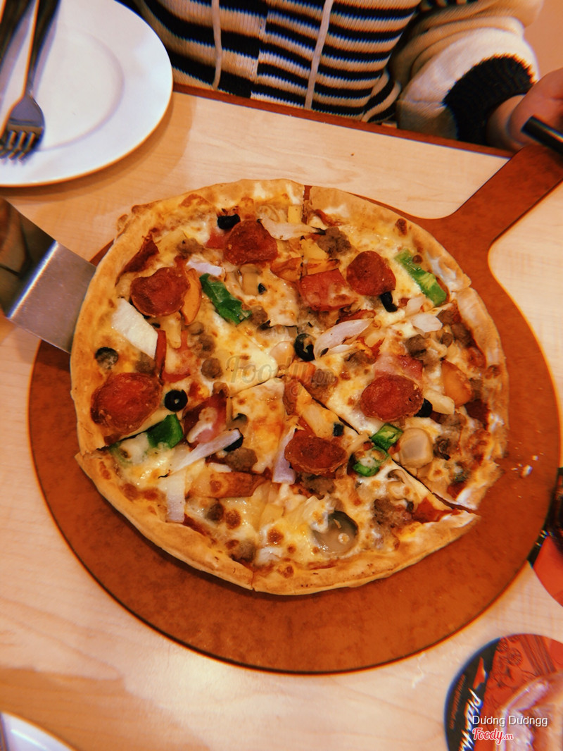 7.0Pizza Hut - Royal CityMình order gọi đồ ship về. Chờ ship tầm 45-50p. Khá là đói trong lúc chờ. Gọi trong thời gian Pizza Hut có chương trình buy 1 get 1 ( tất nhiên get 1 với loại bằng và rẻ hơn cái đã gọi chính). Mình nhớ gọi loại size vừa và gọi chính không phải là hải sản pepper ( mà đói quá ăn xong cũng không để ý), ăn khá là cay với những người không ăn được cay. Tổng thế thì mức ổn. Loại còn lại là thịt nguội và dứa. Vị với cá nhân mình thì hơi mặn chút. Ăn nóng mỗi người ăn tầm 2-3 miếng. ...Xem thêm